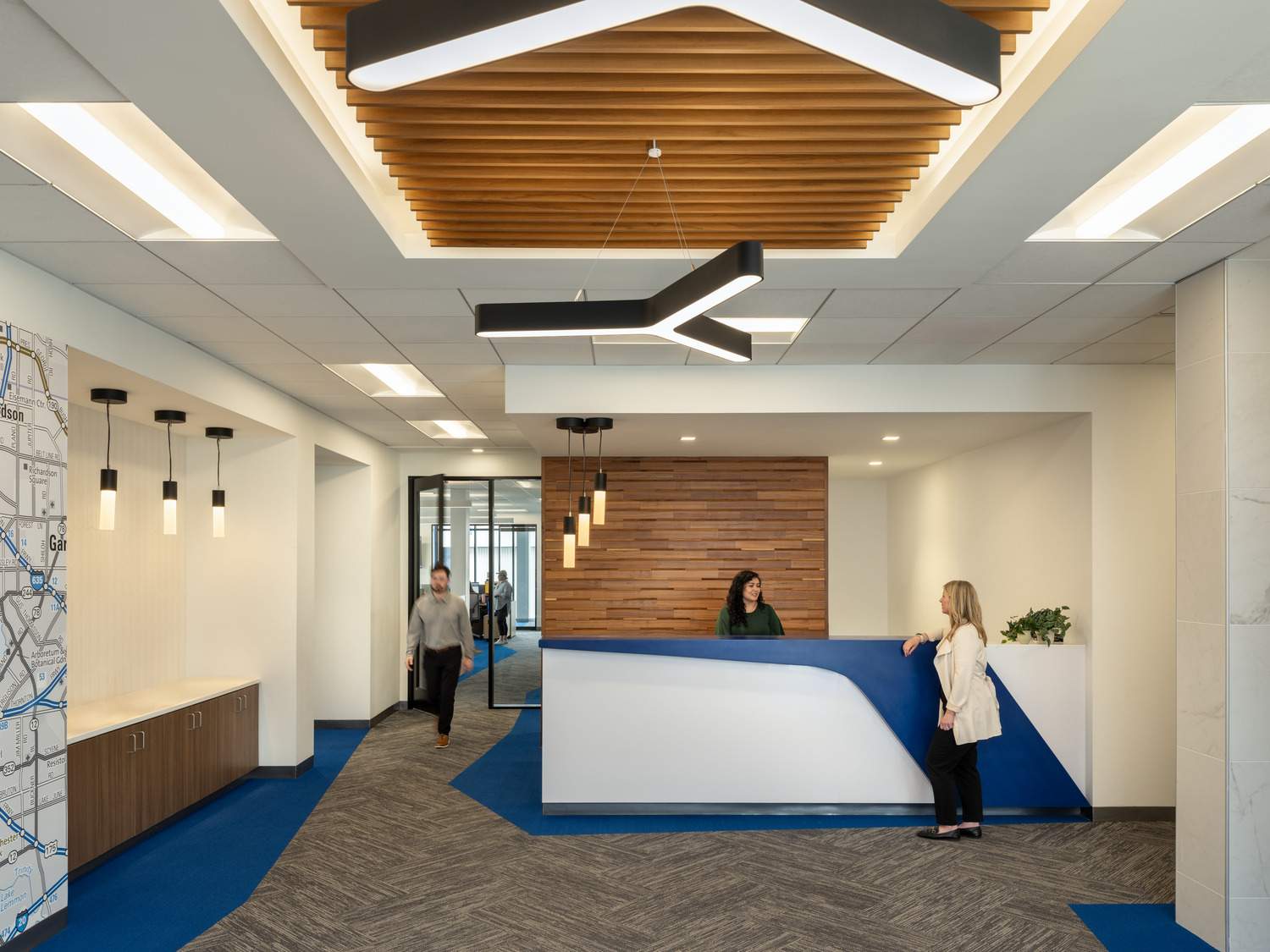 The interiors emphasize daylighting, transparency, and intuitive circulation. Acoustic zoning separates louder, public-adjacent areas from quieter work zones, while durable yet warm finishes—glass, accent colors, and refined details—balance technical requirements with a welcoming atmosphere.