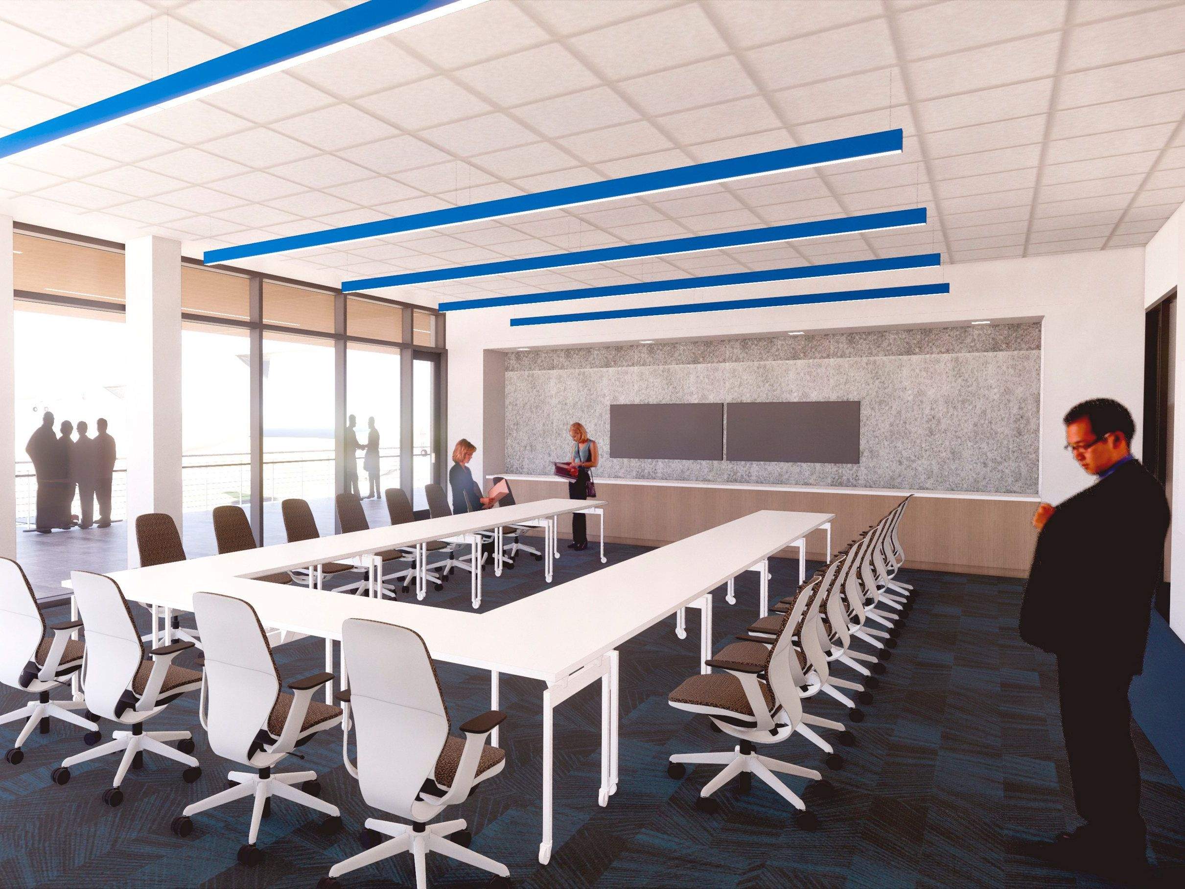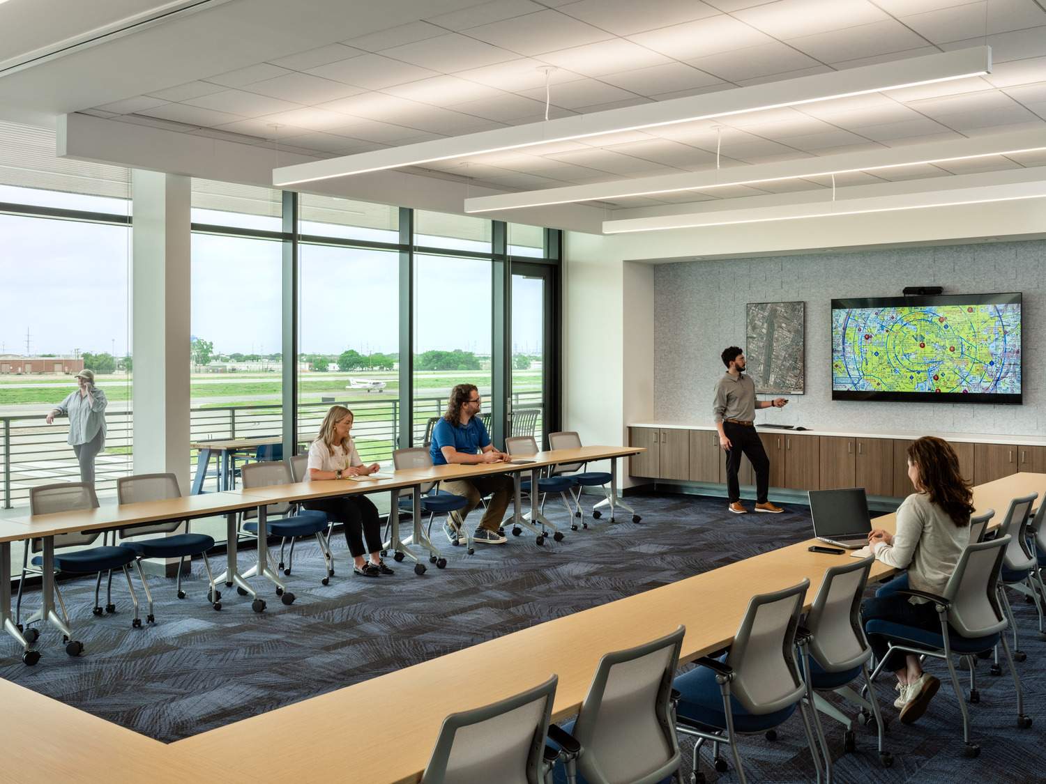 A multi-function conference space anchors the level, designed for flexibility—supporting staff meetings, stakeholder coordination, and briefings. Glazing and visibility to the airfield connect these gatherings back to the airport’s core operations.