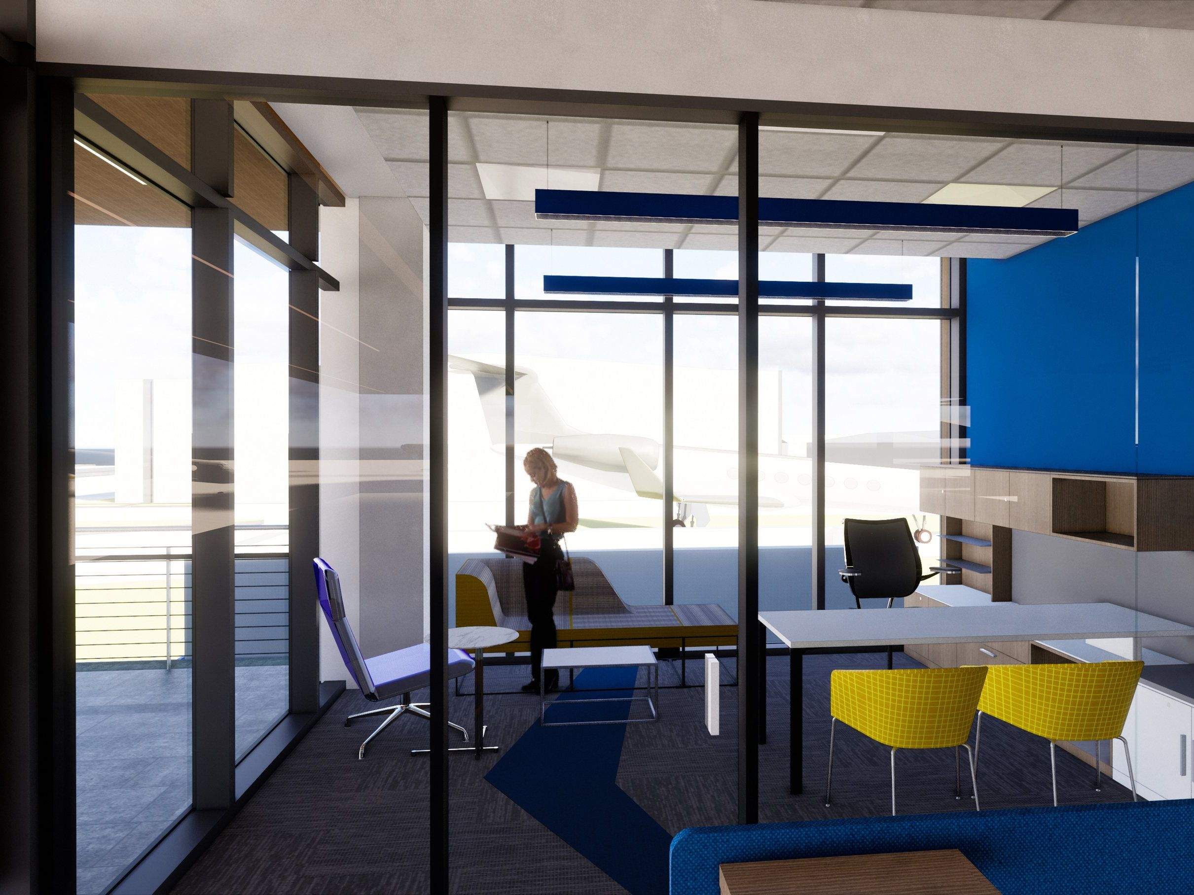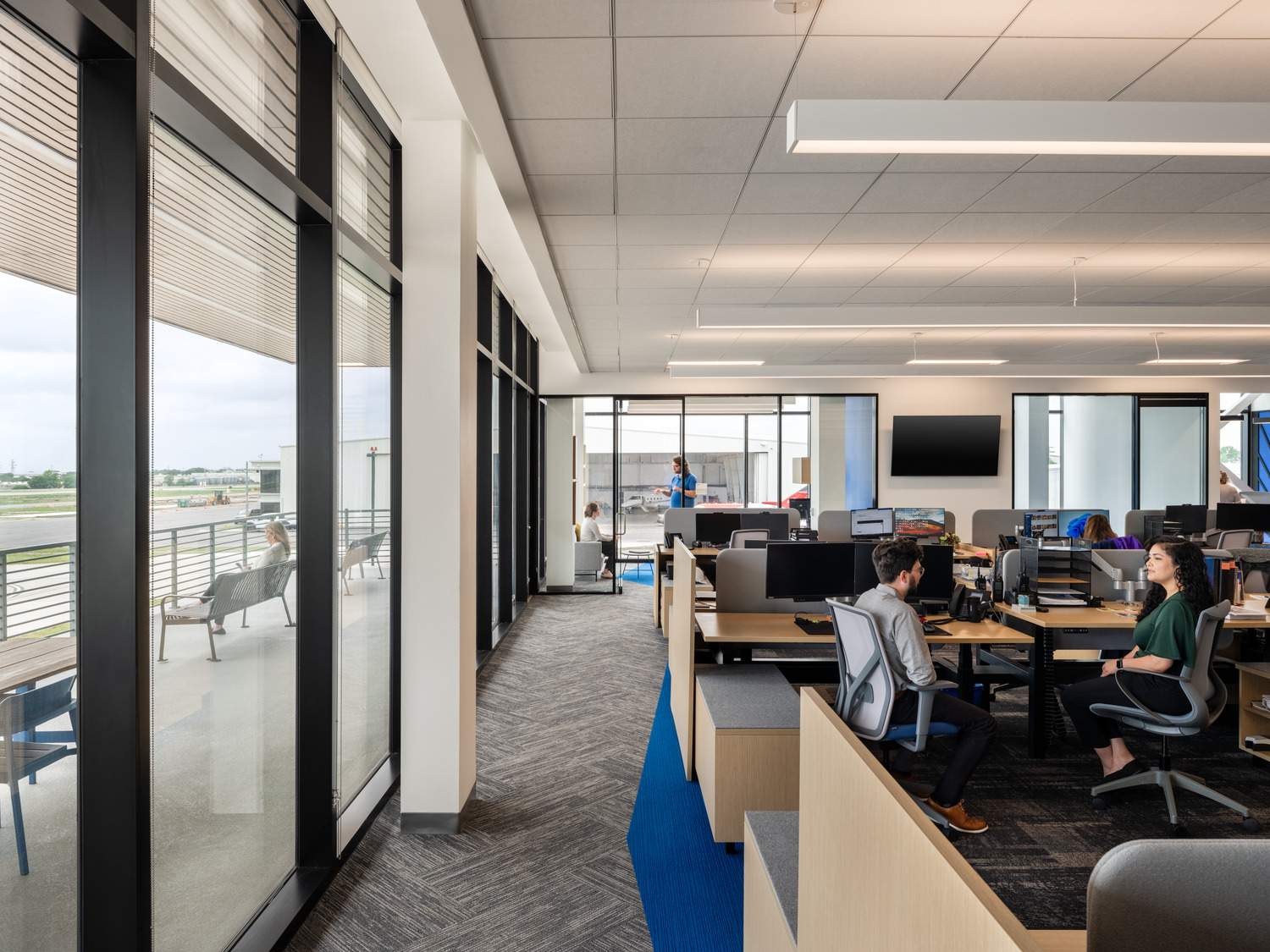 Above, airport administration is consolidated in a modern workplace environment with conference and observation spaces that connect staff to the airfield.