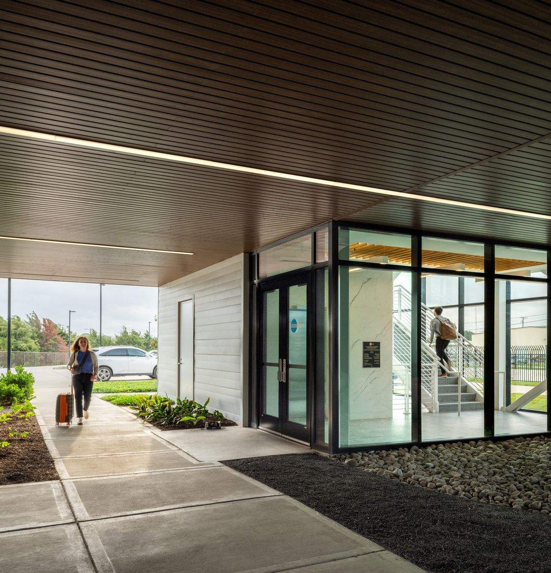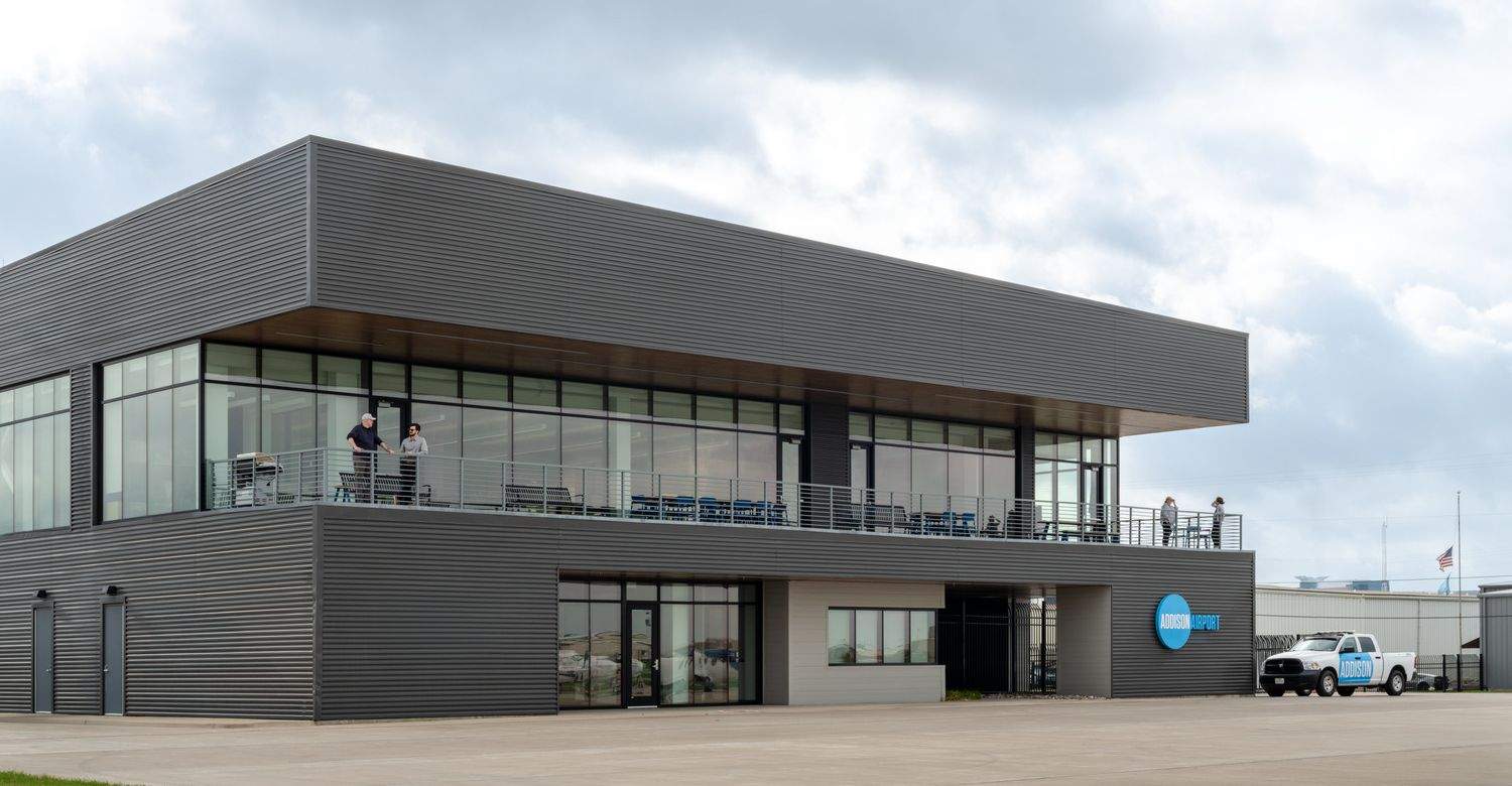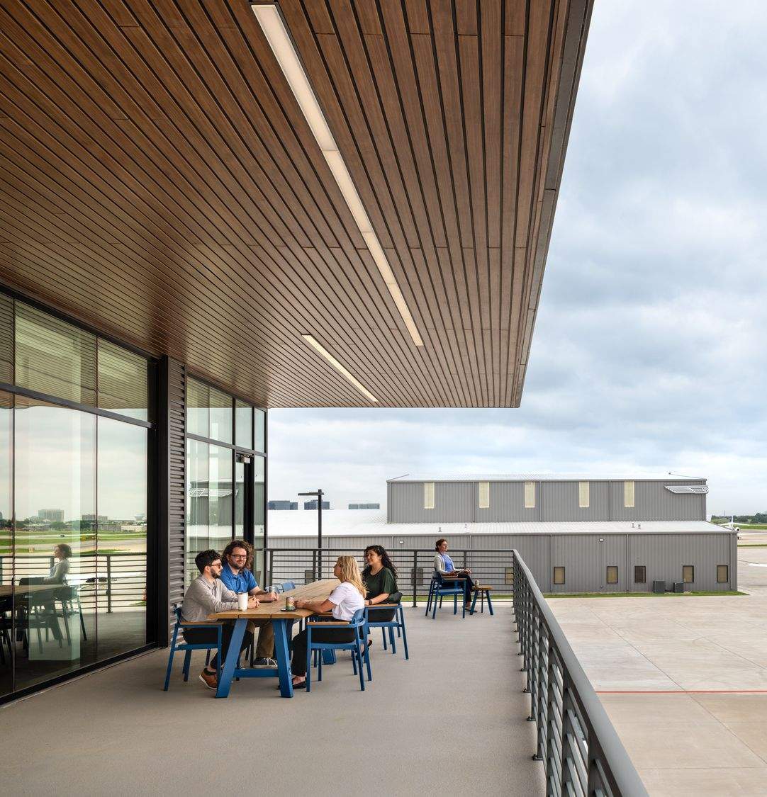 A linear observation deck runs along the building edge, framed by expansive glazing. This feature provides a functional vantage for staff and visitors while creating an experiential connection to the airfield.