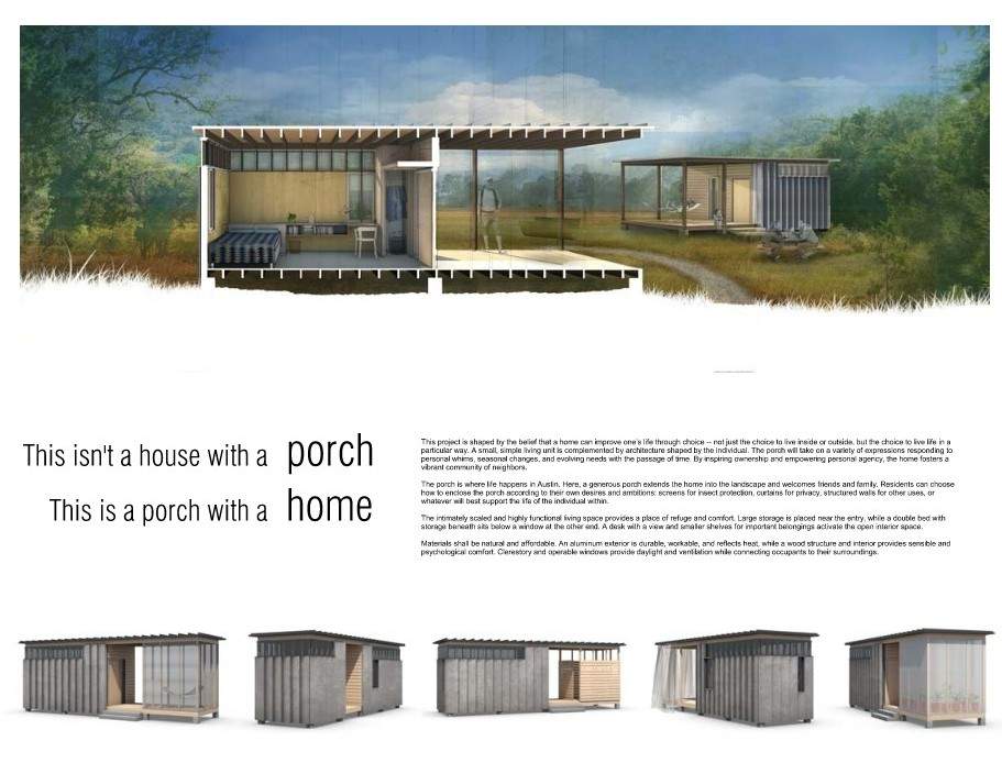 Together with four fellow architects from Page/, we developed a concept we titled Porch with a Home. Although it was not selected as a competition winner, the Founder and CEO of Mobile Loaves & Fishes admired the design and made it available for construction.