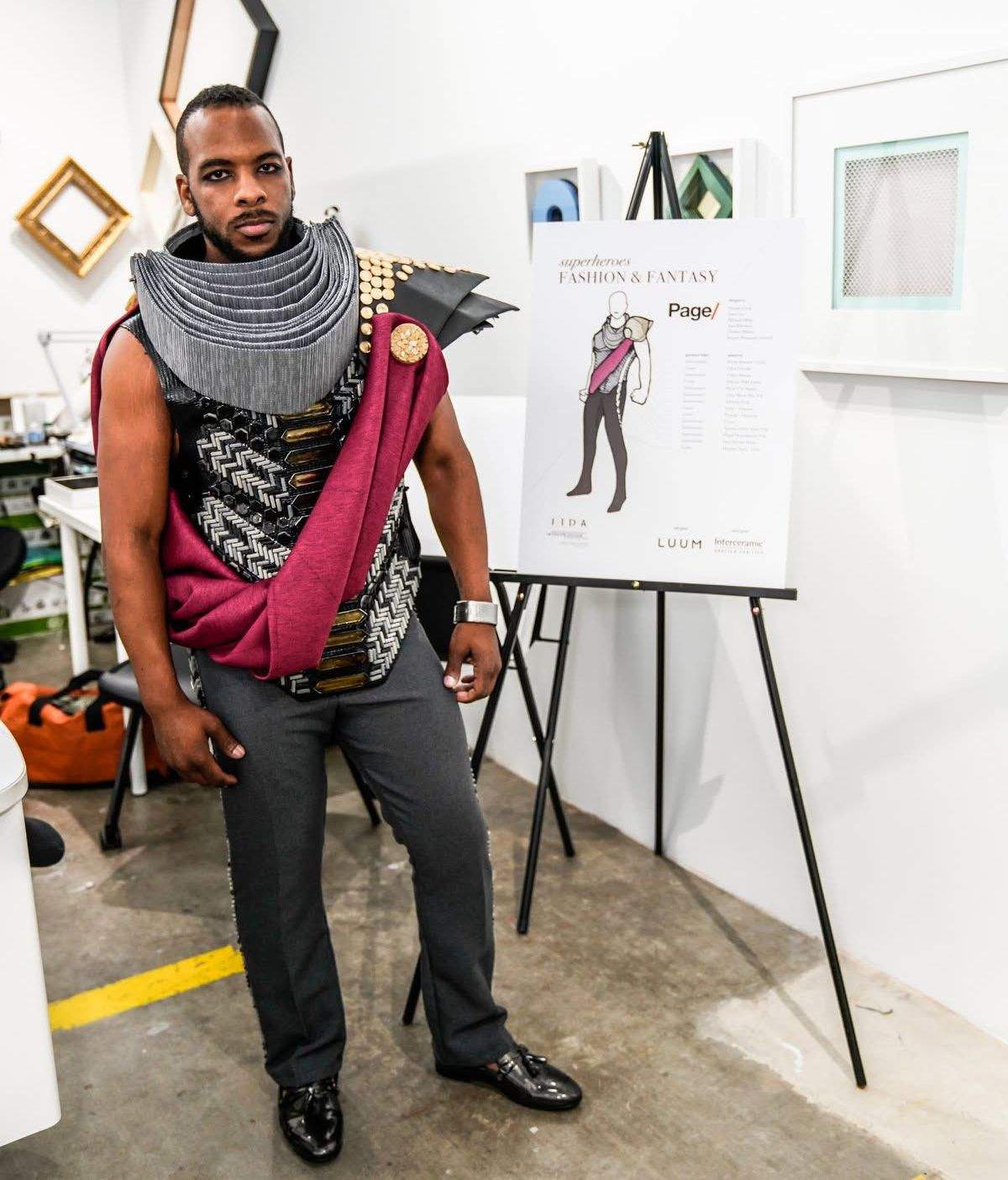 Our overall theme that year was Meet Me at the MET, and our assigned category was Superheroes: Fashion and Fantasy. The Houston event is known for encouraging dramatic outfit transformations, so we designed a high-fashion cowl neck that doubled as a helmet and a chest scarf that transformed into a cape.