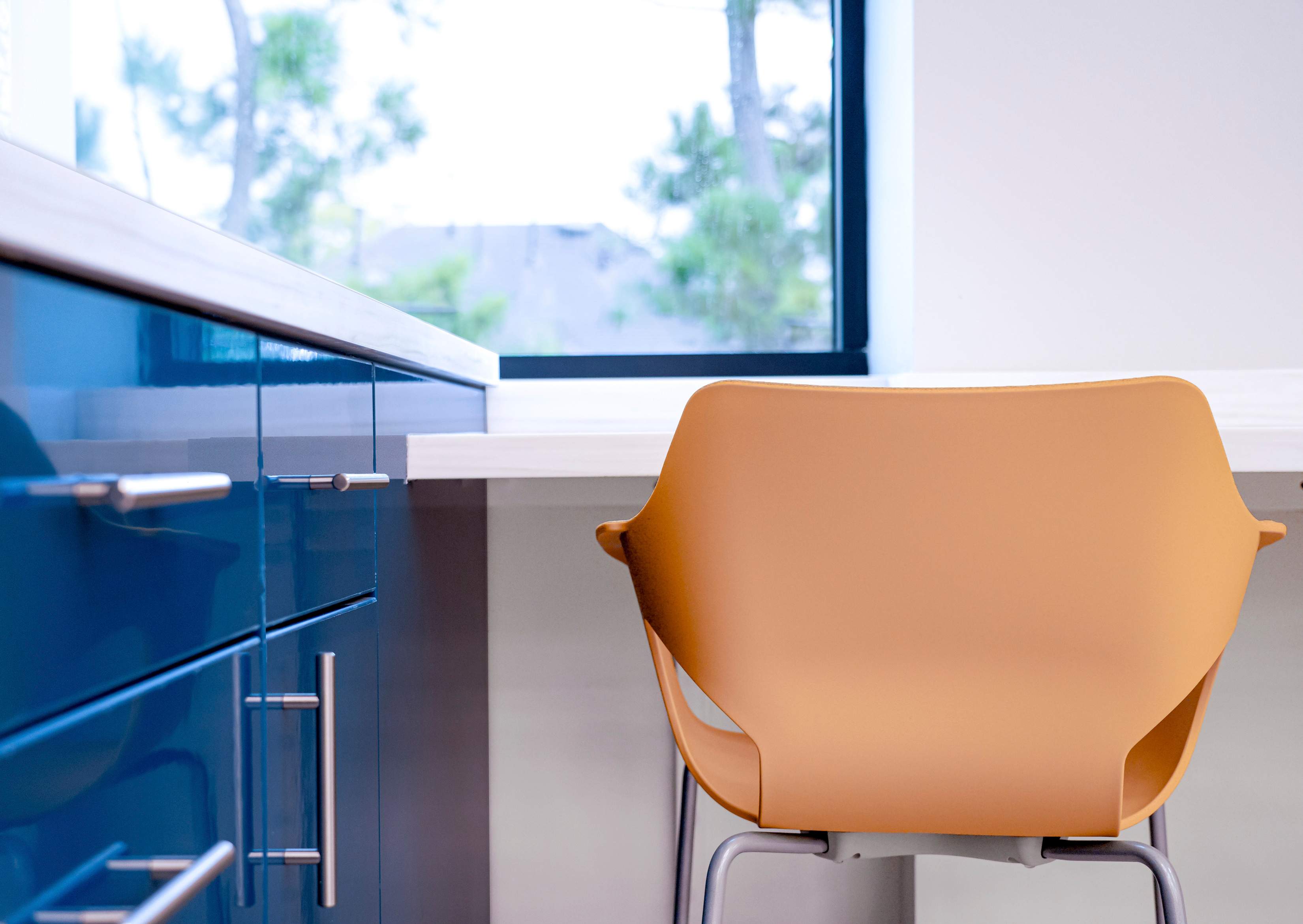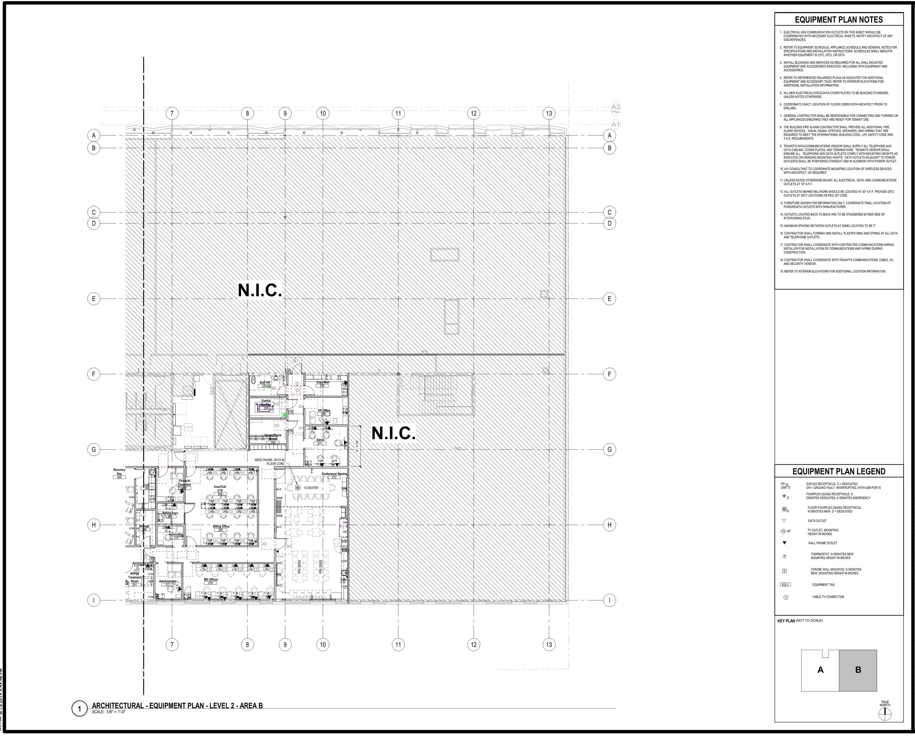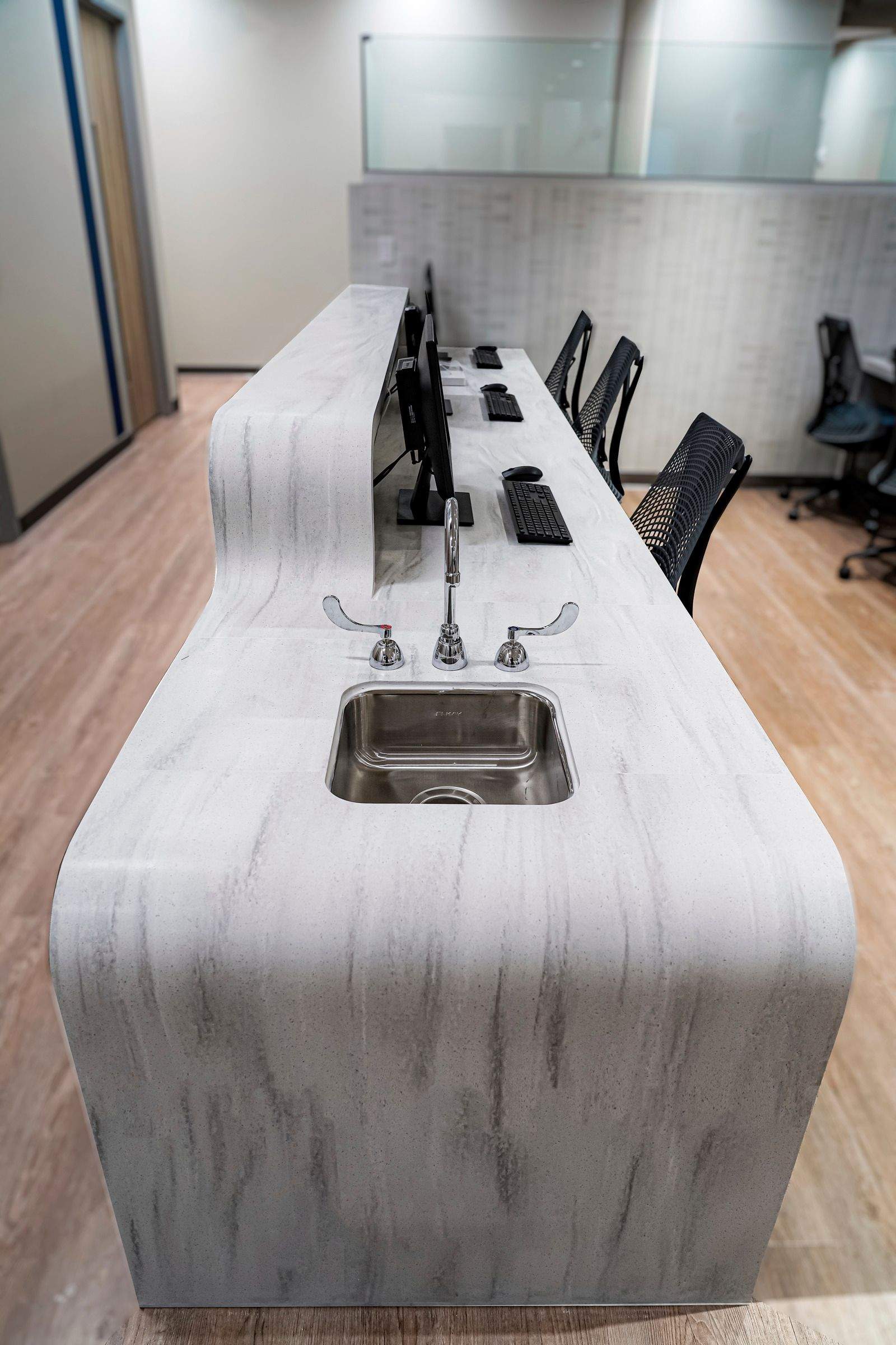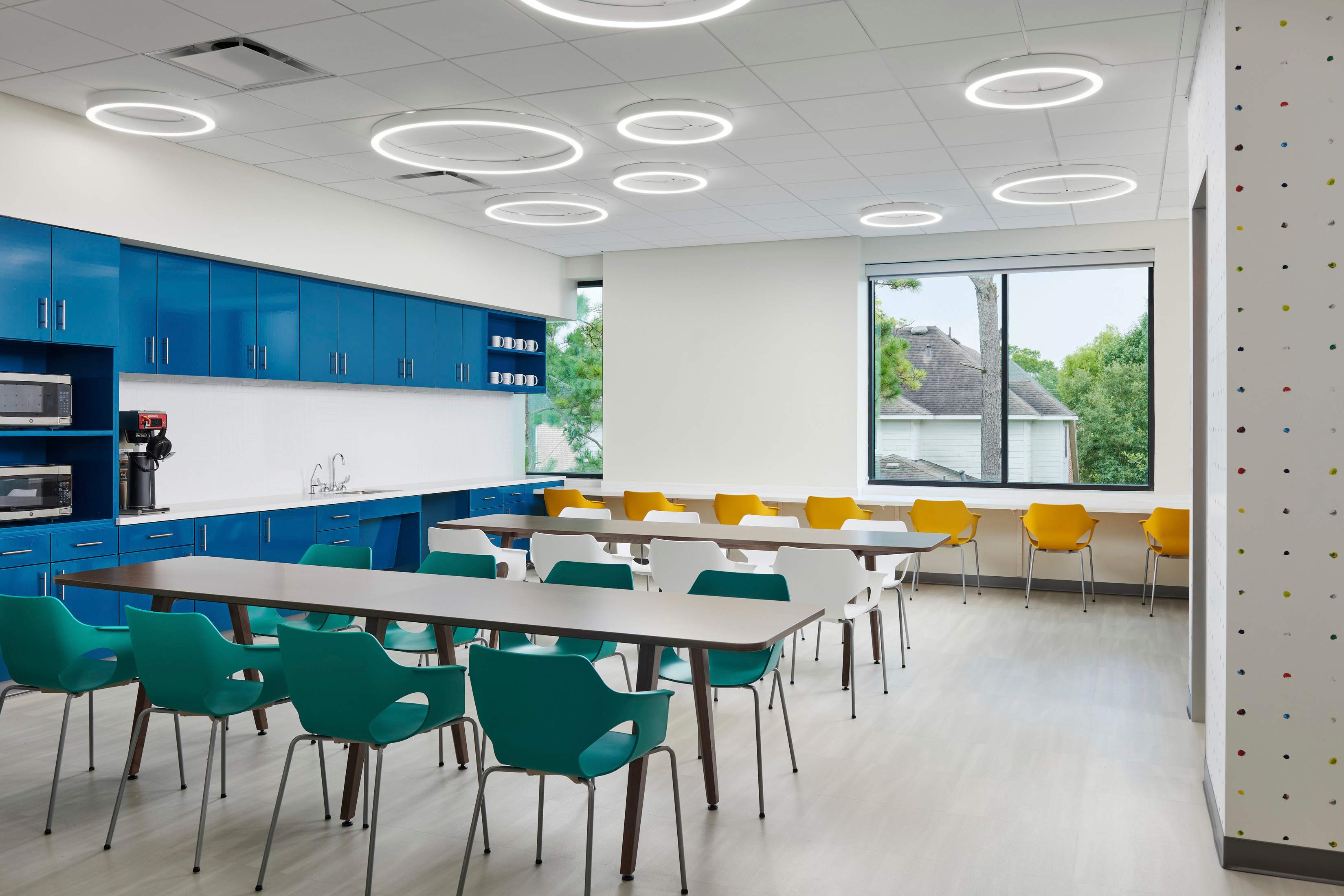 These zones were integrated into the floor plan to give nurses’ stations direct sightlines to patient rooms, with shared resources placed centrally for departmental access. Acoustic strategies and privacy measures were incorporated to support HIPAA compliance, while staff amenities were designed to balance playfulness with calm.
