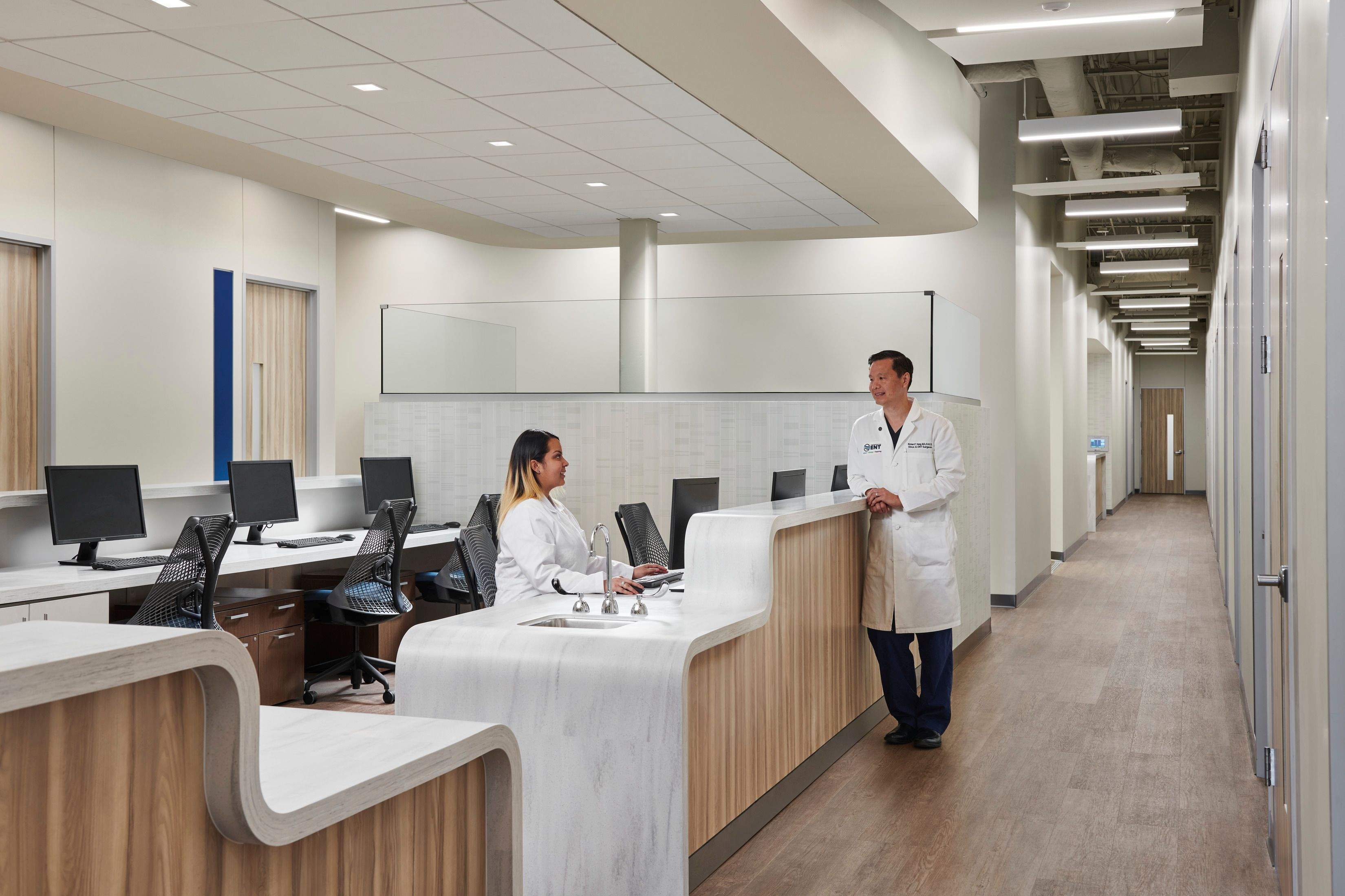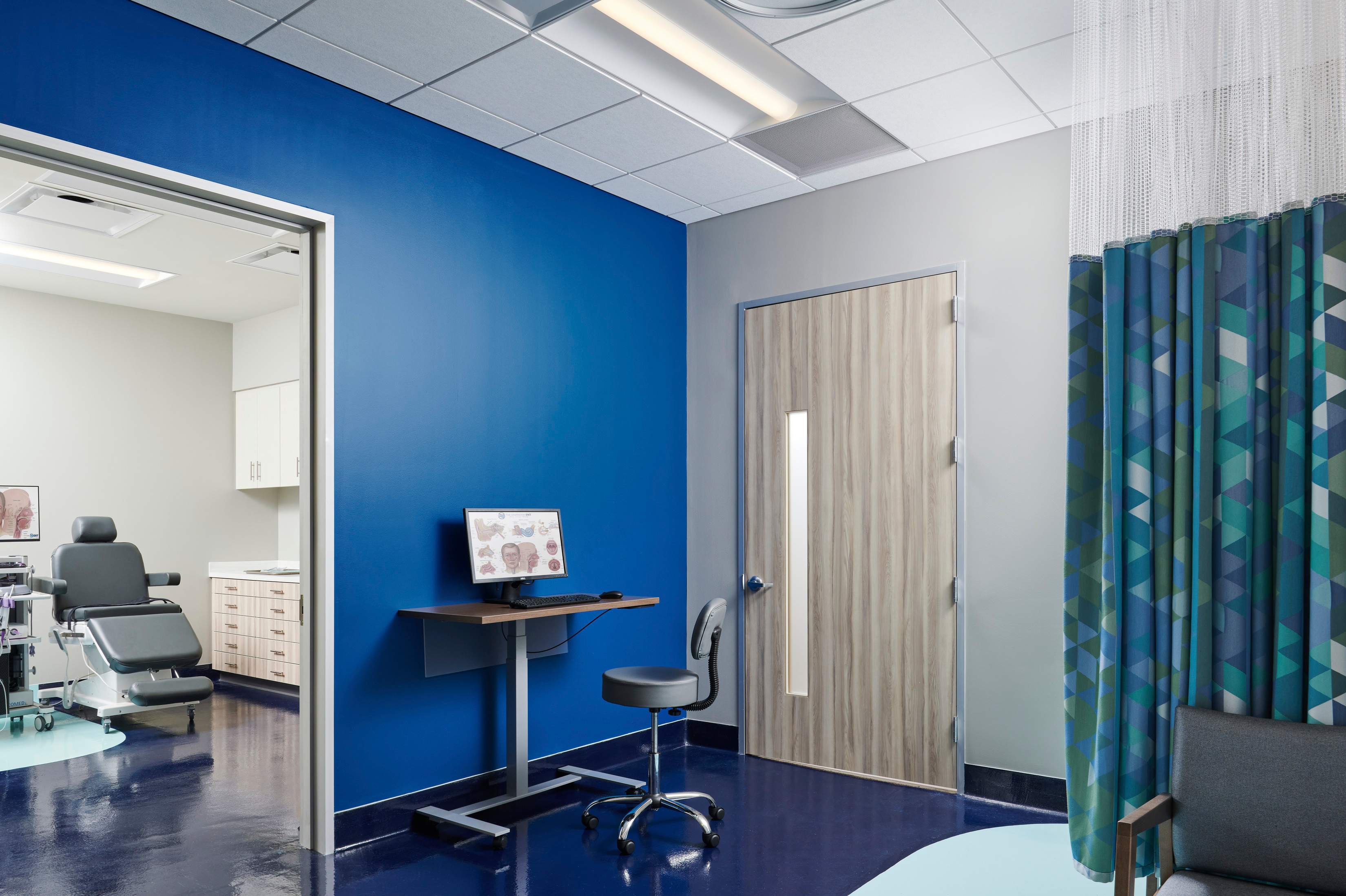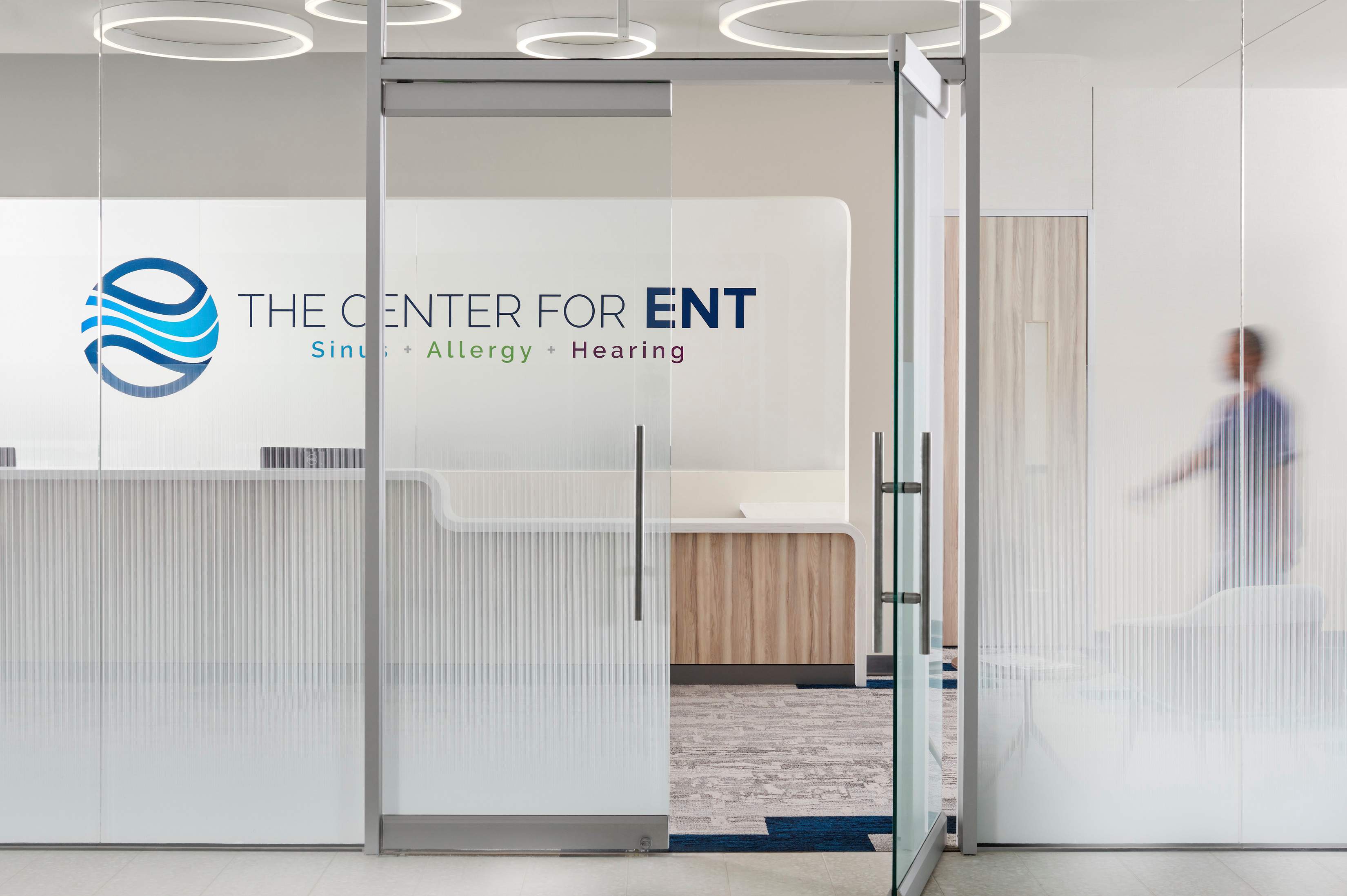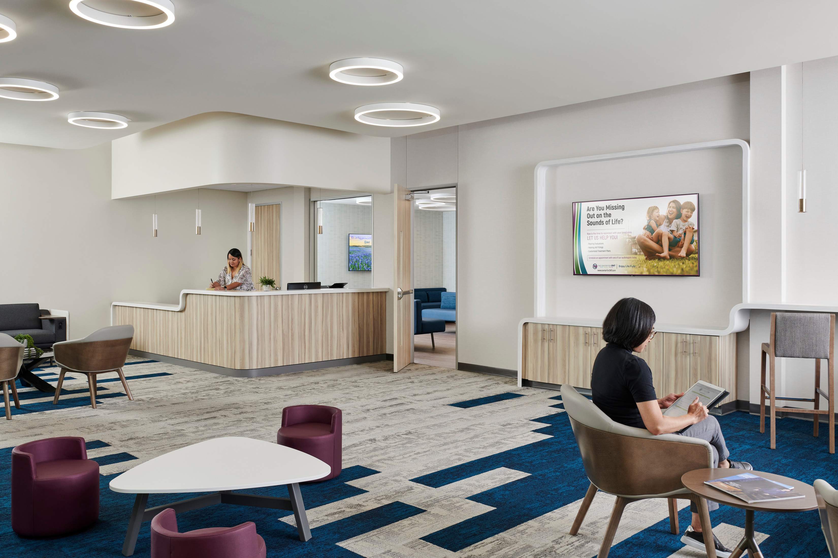 Located on the second floor, the Center for ENT lobby immediately establishes a sense of privacy and ease in a healthcare environment. Graphics, color, texture, and layered light elevate the atmosphere, while inclusive furniture and durable finishes make the space both welcoming and resilient.
