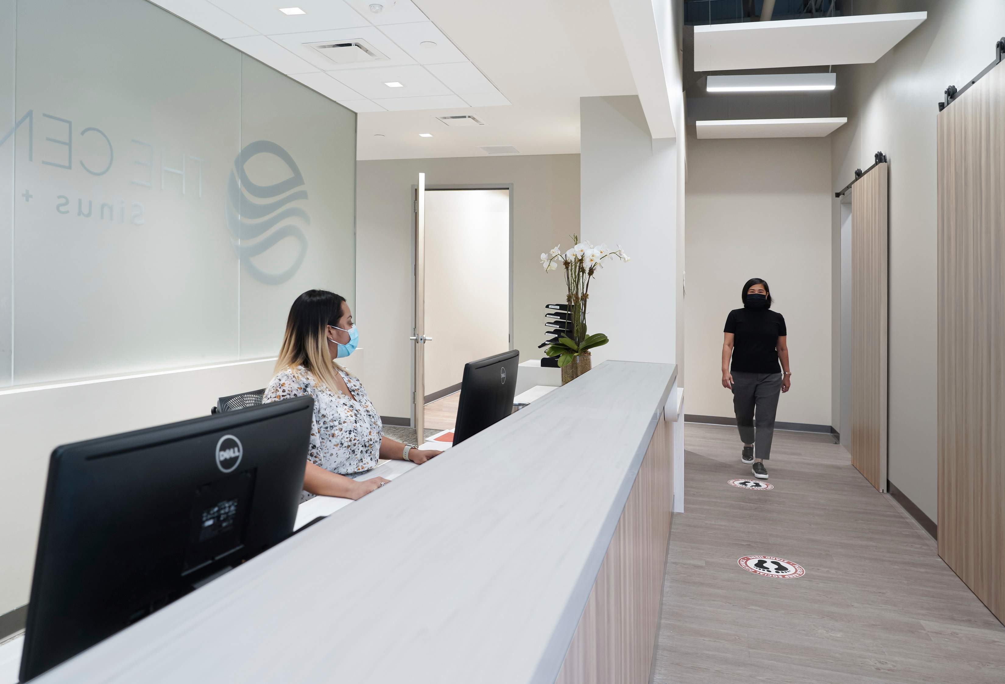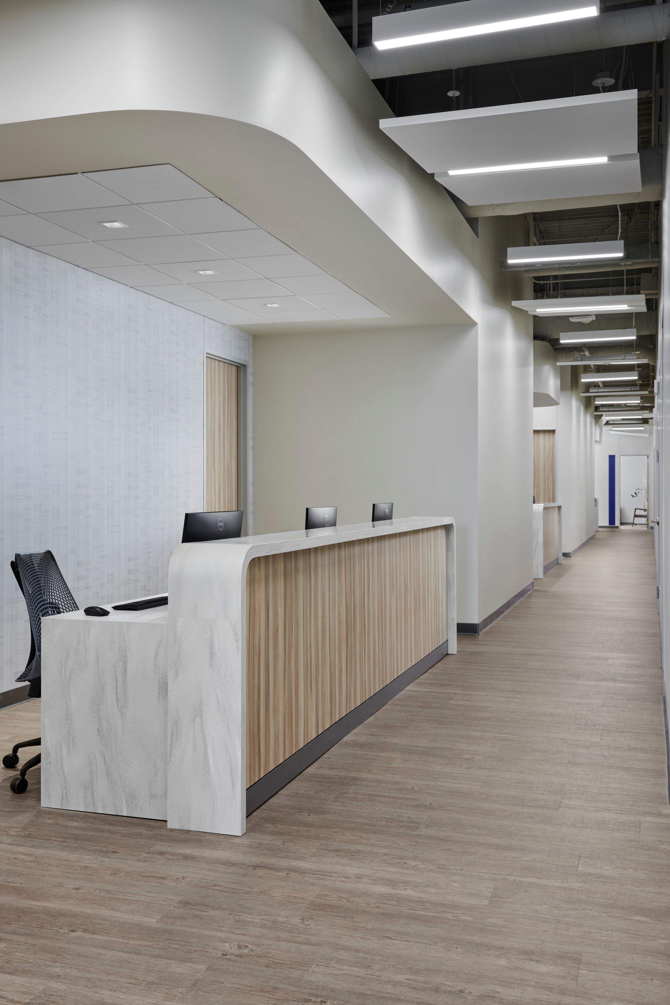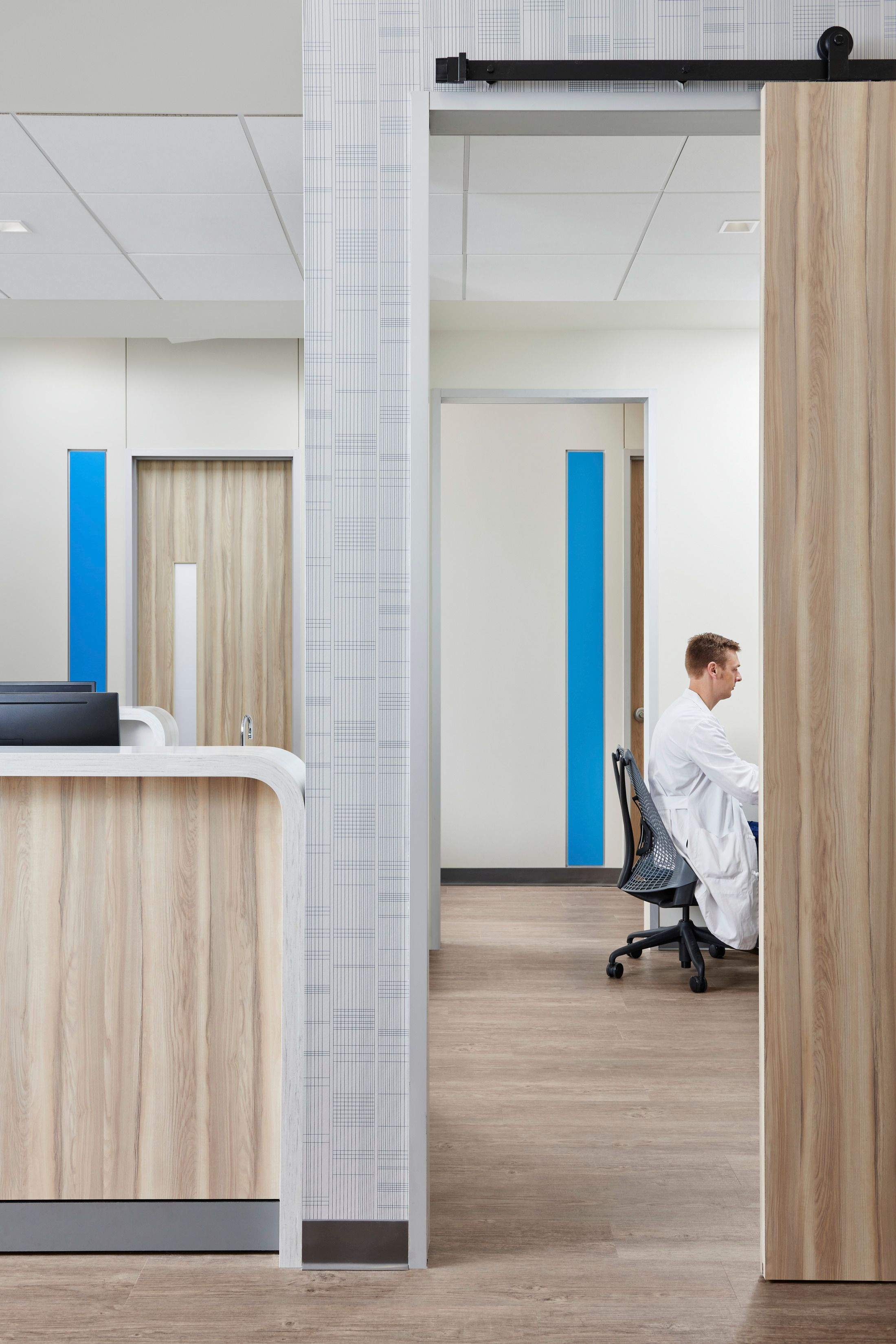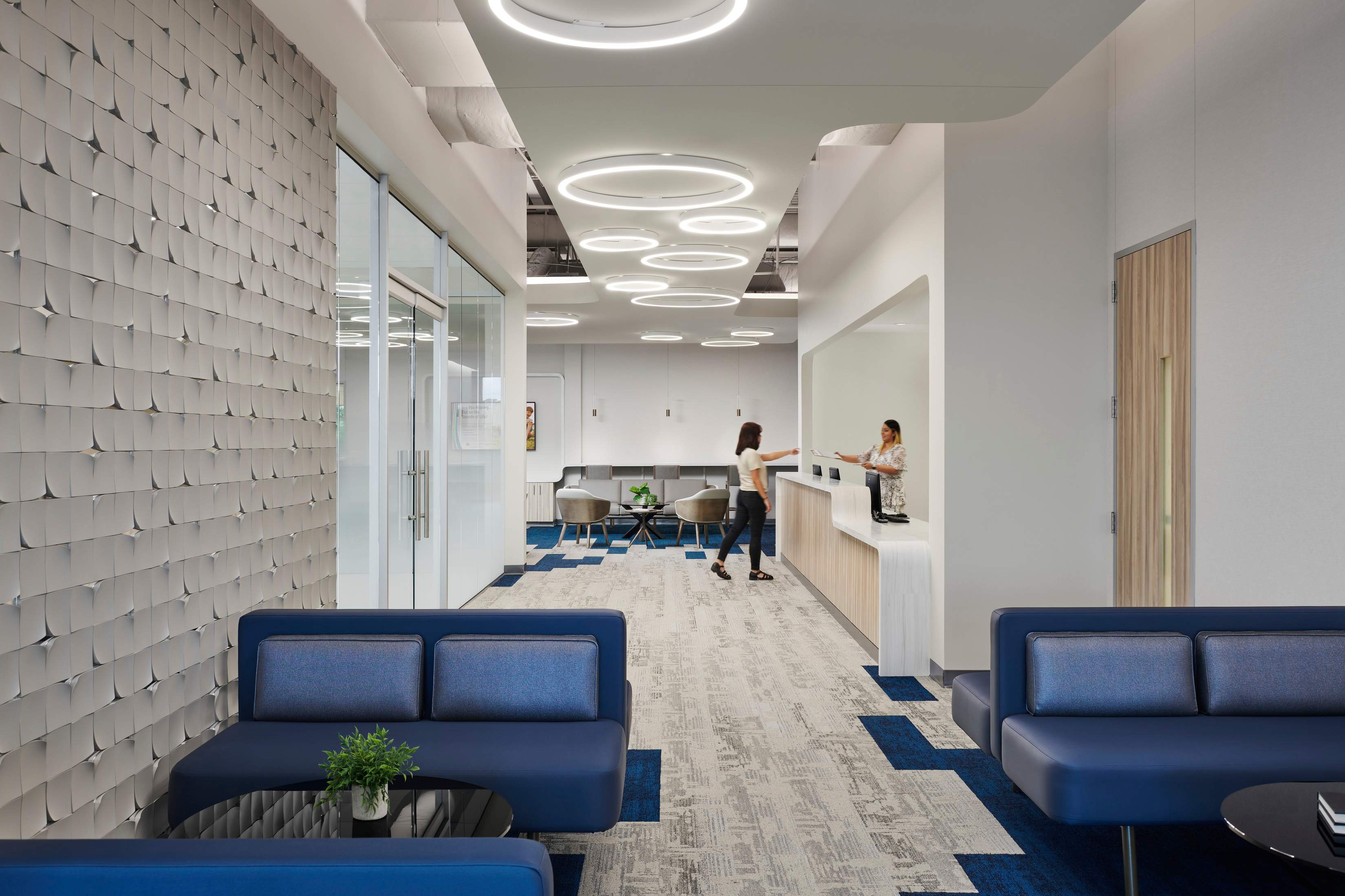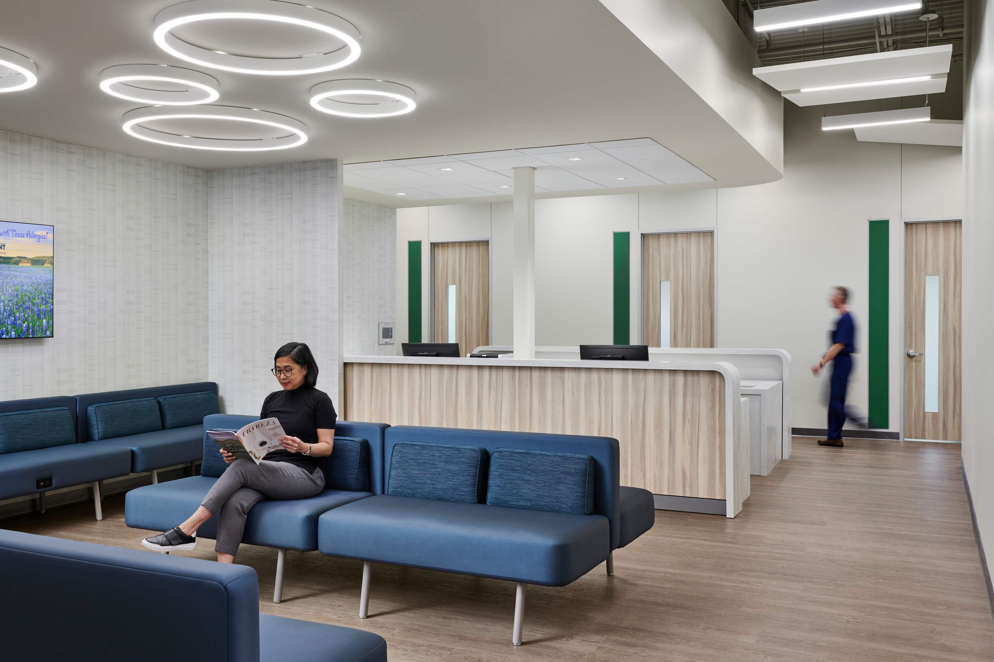 Located on the second floor, the Center for ENT lobby immediately establishes a sense of privacy and ease in a healthcare environment. Graphics, color, texture, and layered light elevate the atmosphere, while inclusive furniture and durable finishes make the space both welcoming and resilient.