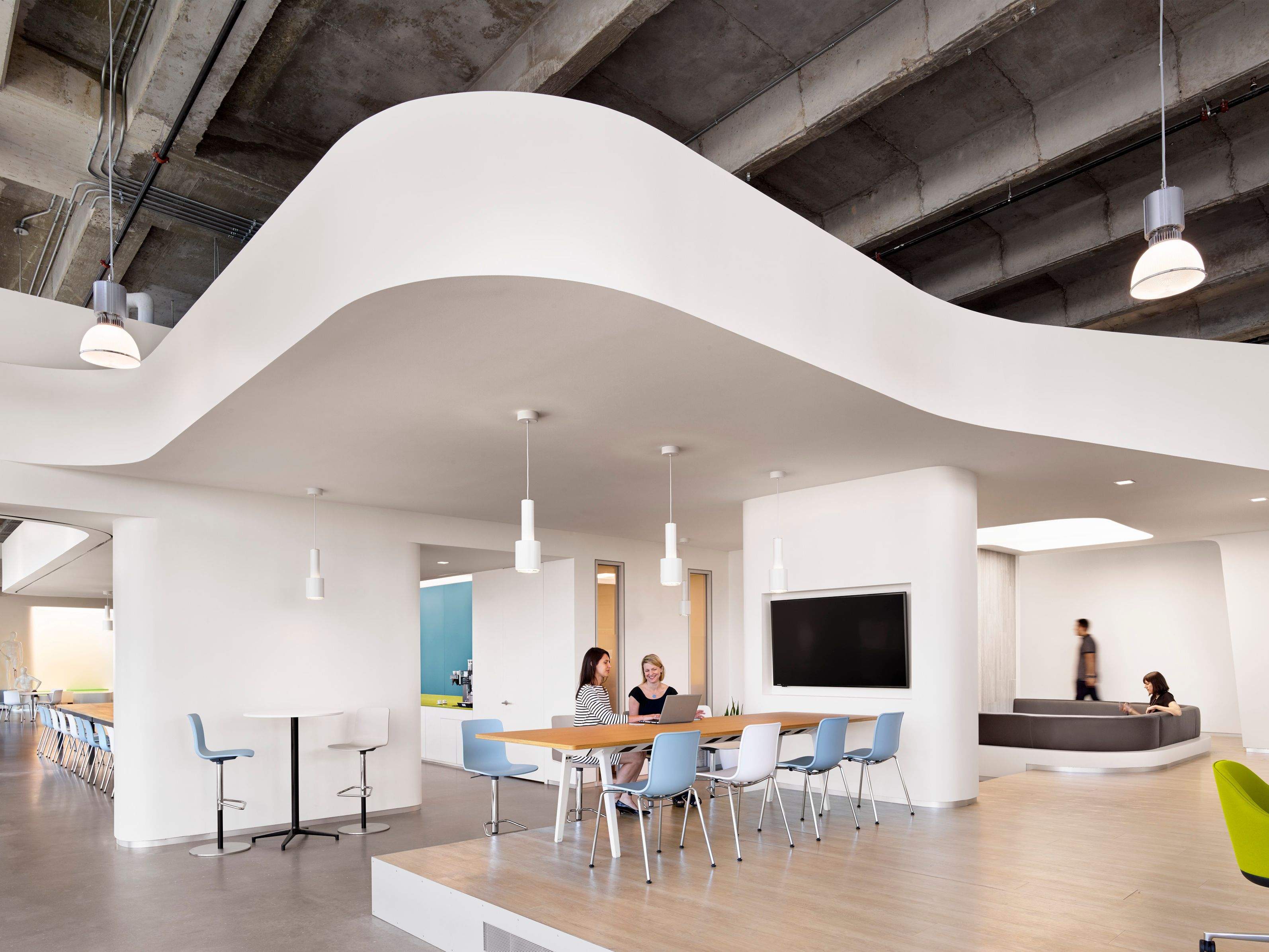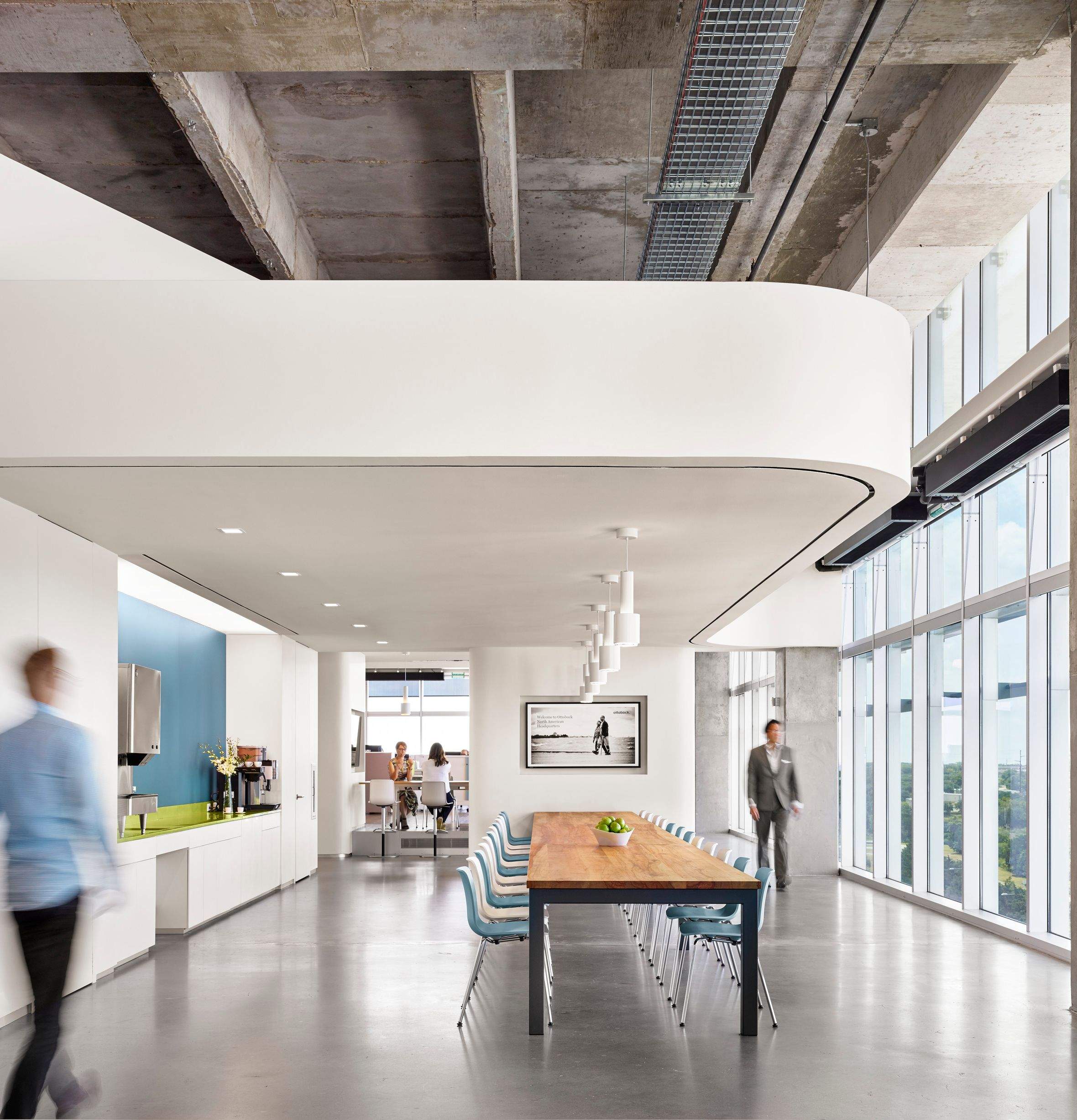 Most furniture selections came from the client’s in-house designer, but seamless coordination was critical to the project’s success. Using their phased furniture plans, all systems were designed for adaptability as the organization grew. Additionally, the project included the challenge of designing a custom 30'-0" Pecan table for the Social Hub.