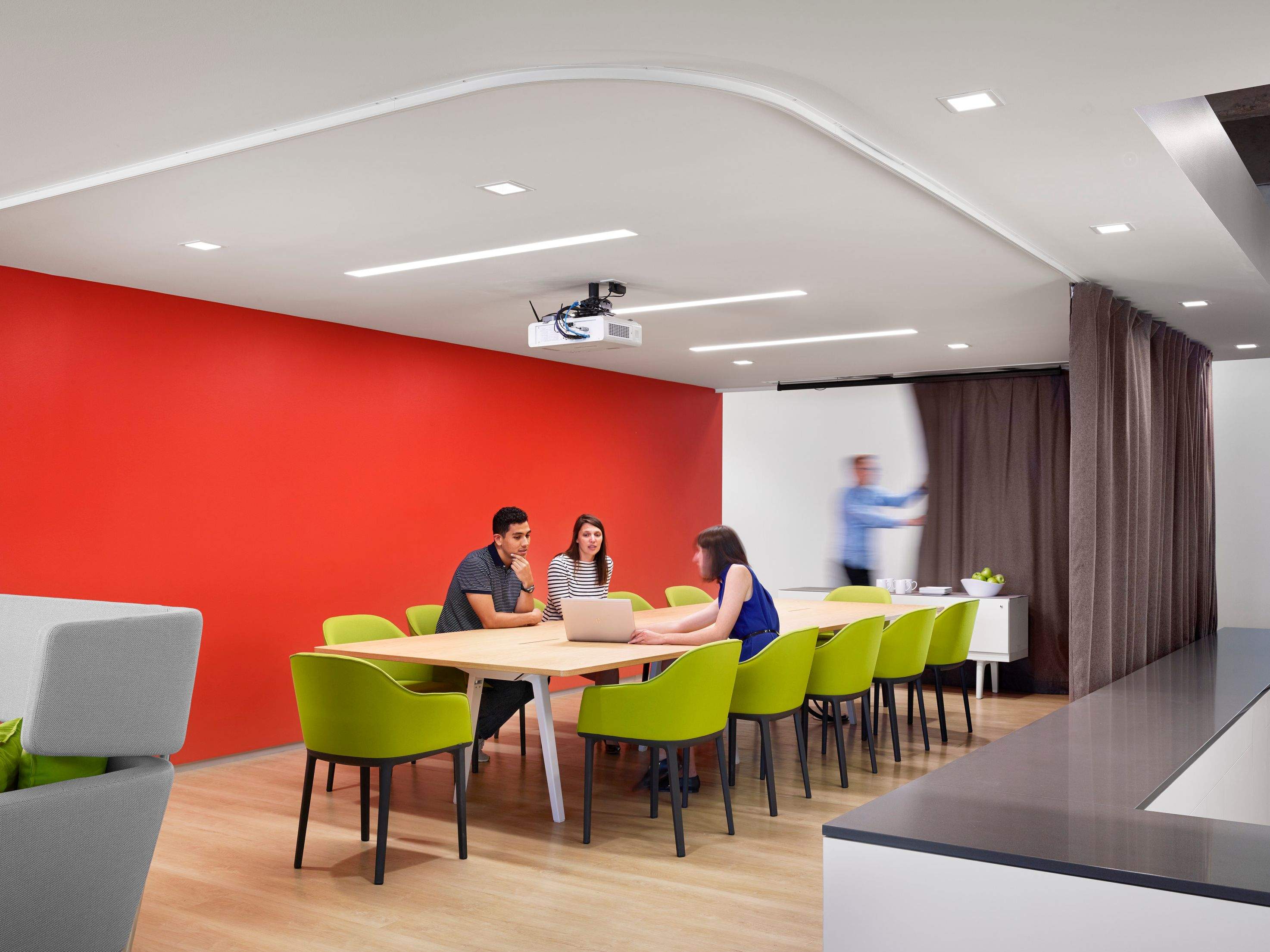 Skylights fell outside the project’s budget, so a cost-effective alternative was delivered by incorporating stretched fabric lighting in the work zones and elevator lobby—capturing the desired effect within realistic constraints.