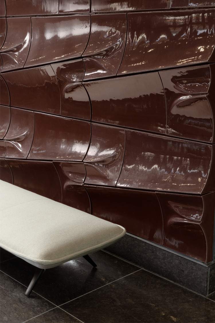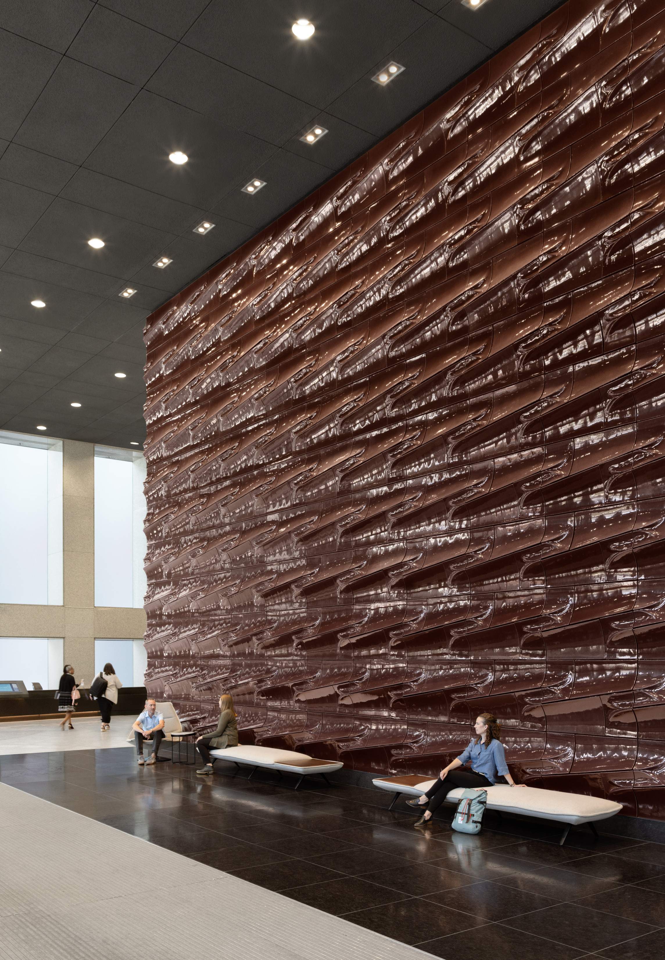 The custom terracotta installation, made of over a thousand uniquely glazed panels, animates the core end caps with shifting light and shadow, adding depth, warmth, and a crafted artistry to the lobby.