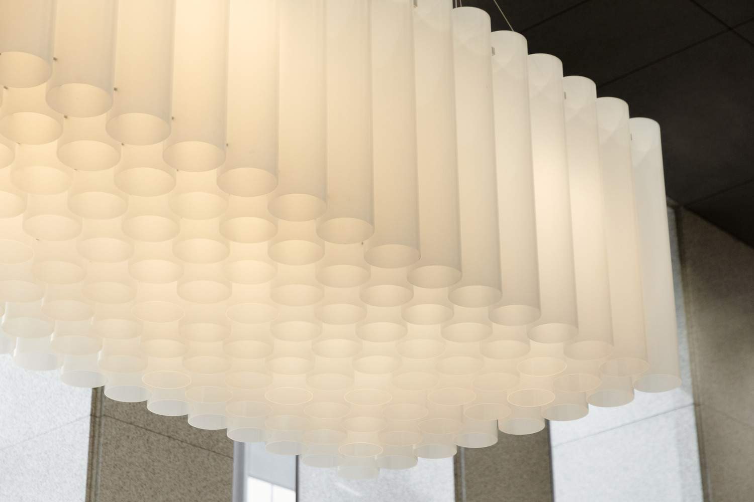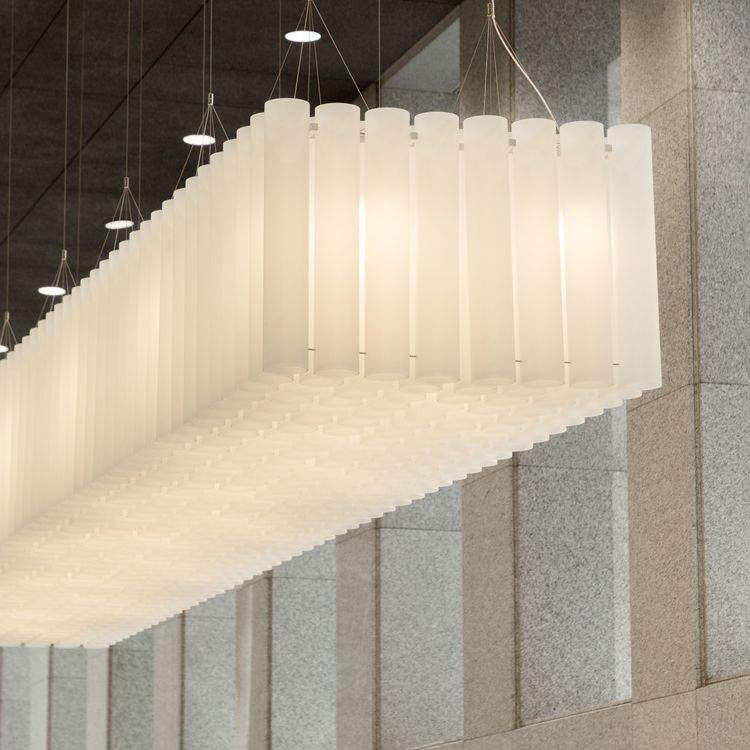 The 30-foot chandelier above the escalators is composed of an ecoresin tubes fitted with addressable LED nodes, each programmed for precise control of color, brightness, and sequencing, creating layered patterns of light that shift from subtle gradients to bold animated displays across the lobby.