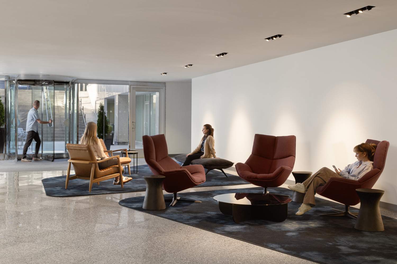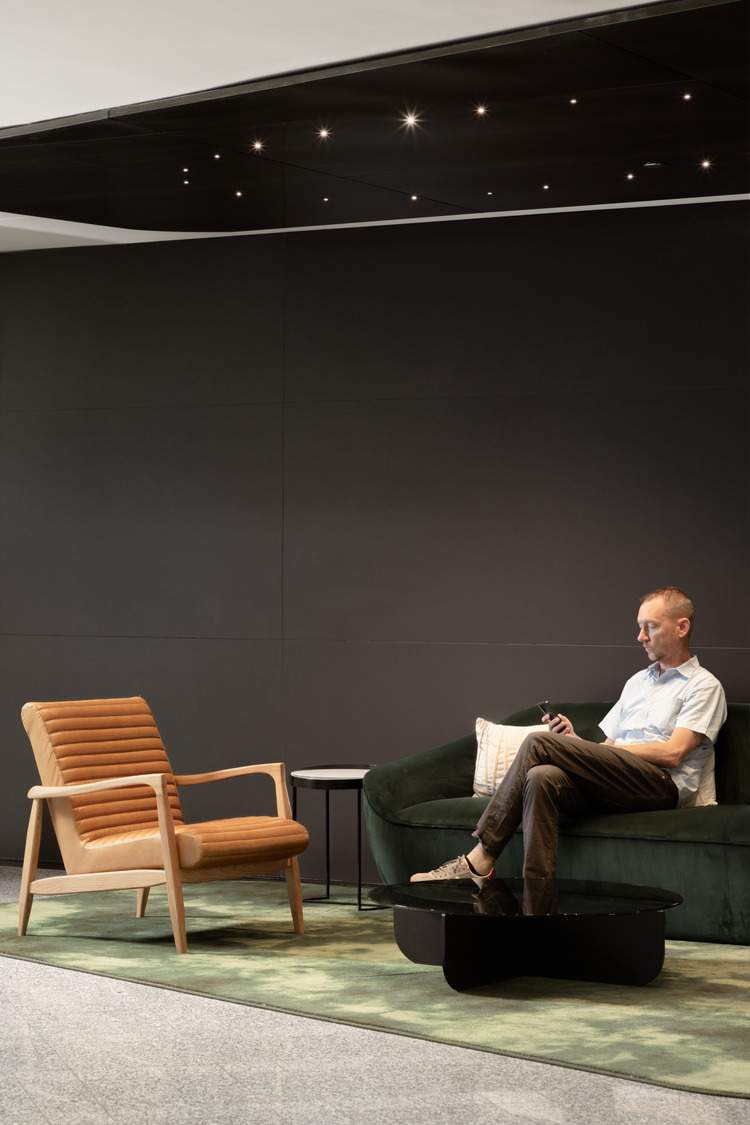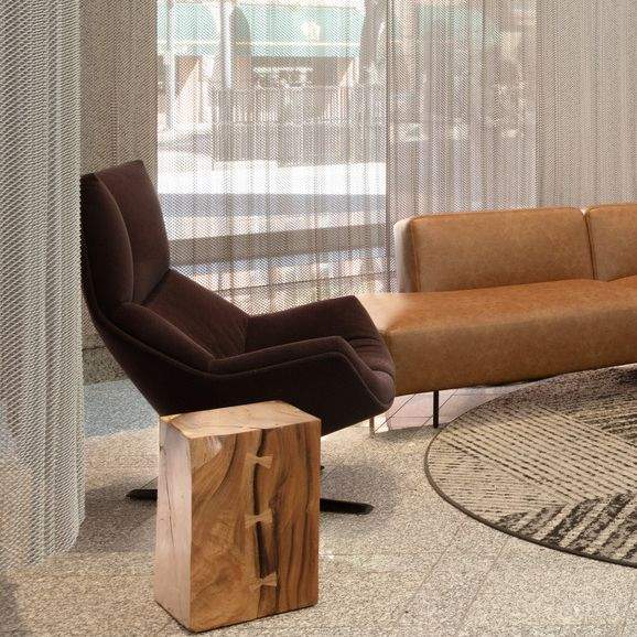 Together, these layered elements enrich the lobby with texture, softness, and spatial variety, enhancing both the functionality and the character of the reimagined interior.