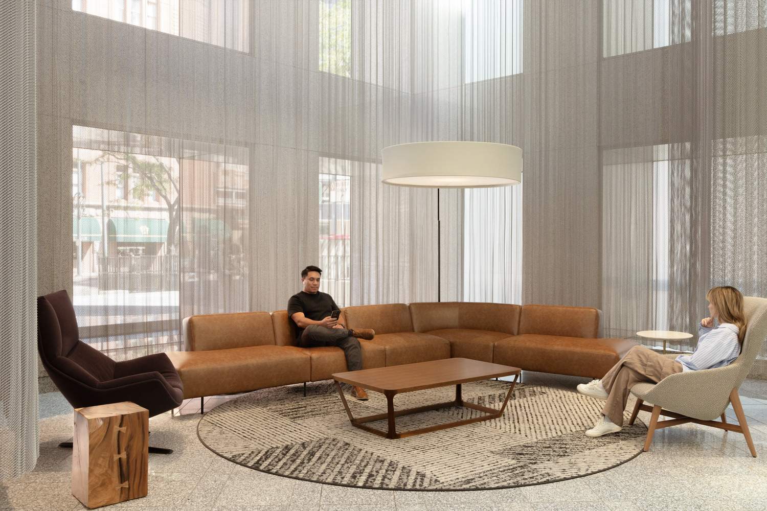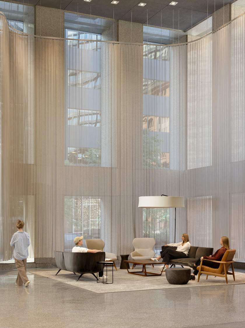 Floor-to-ceiling metal mesh curtains introduce layers of transparency and separation, allowing the vast lobby to flex between grand and intimate settings. Hospitality-inspired furnishings, warm materials, and carefully considered details elevate the atmosphere, while the redesigned exterior plaza, with new seating, landscaping, and shade structures, extends the building’s renewed energy and presence onto the 16th Street Mall.