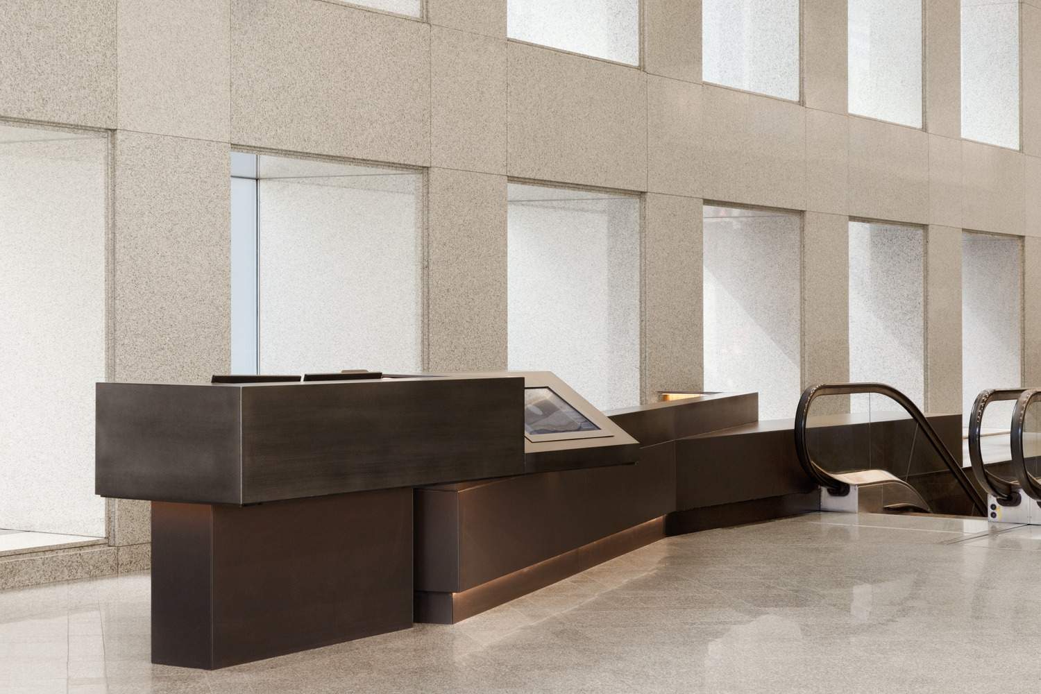 The Republic Plaza lobby renovation layers drama, craftsmanship, and hospitality into a refined new composition. The security desk, with user kiosks seamlessly integrated, becomes a sculptural anchor at the entry. Its crisp geometry and rich finishes creates gestures of form and material that guide movement through the space.