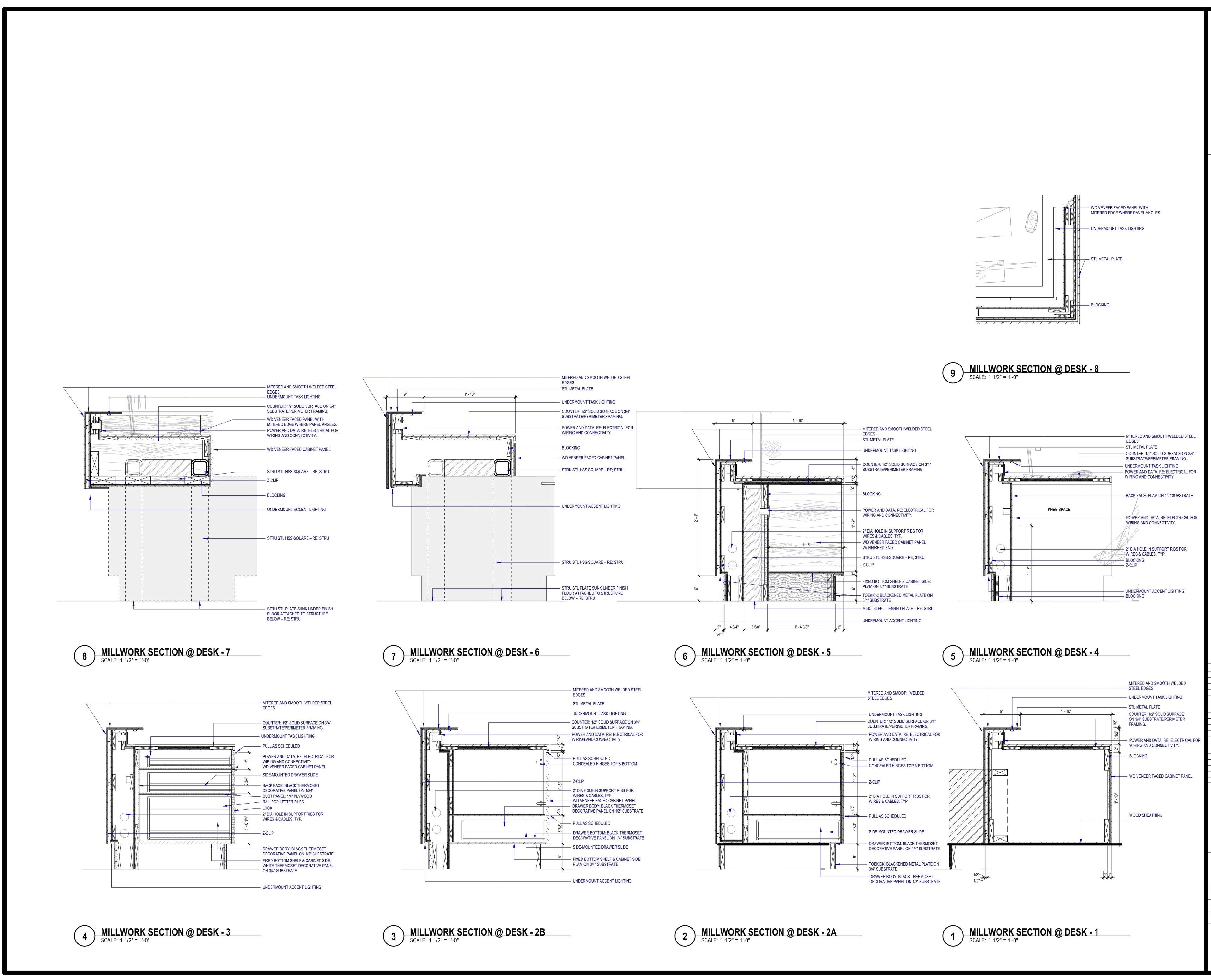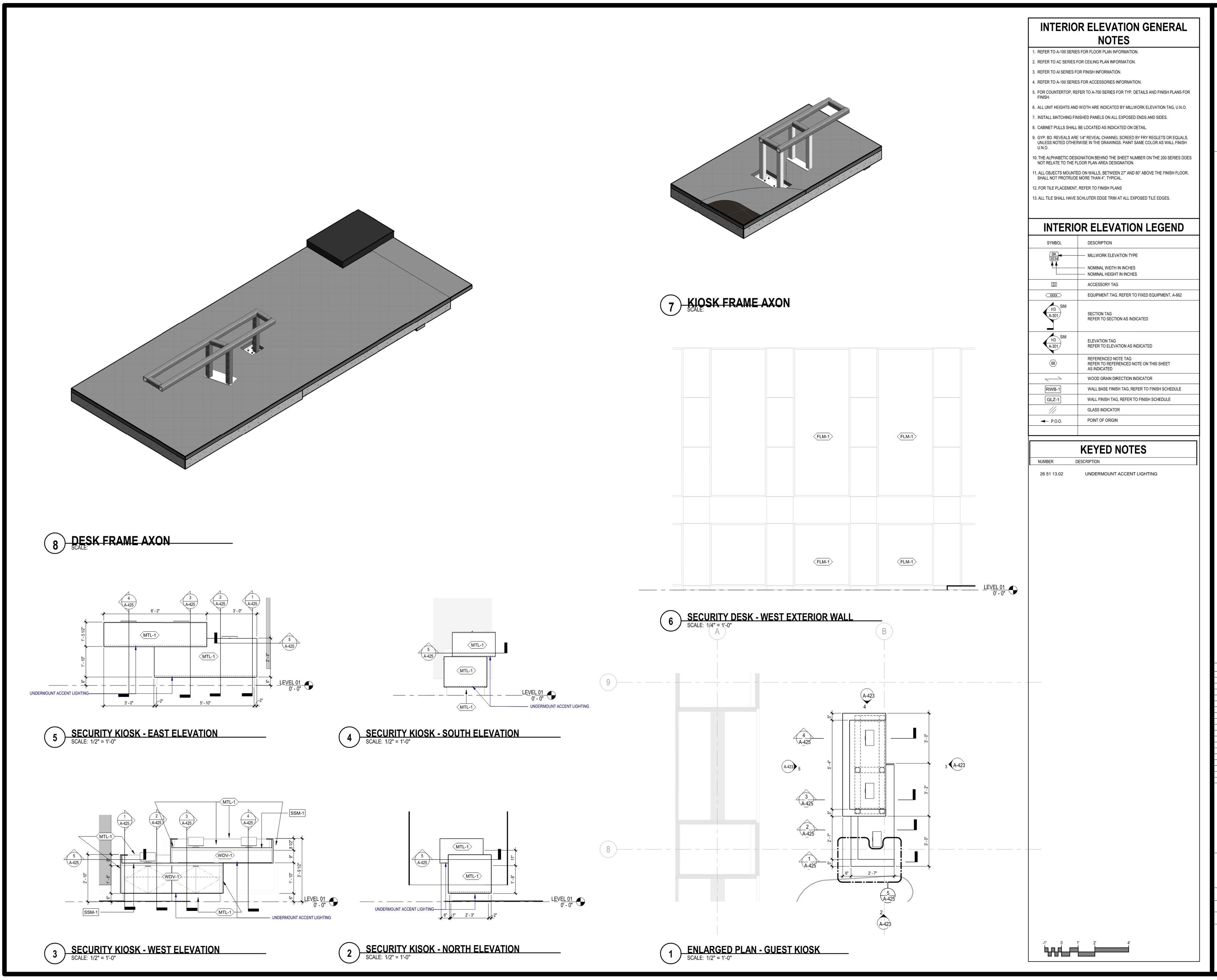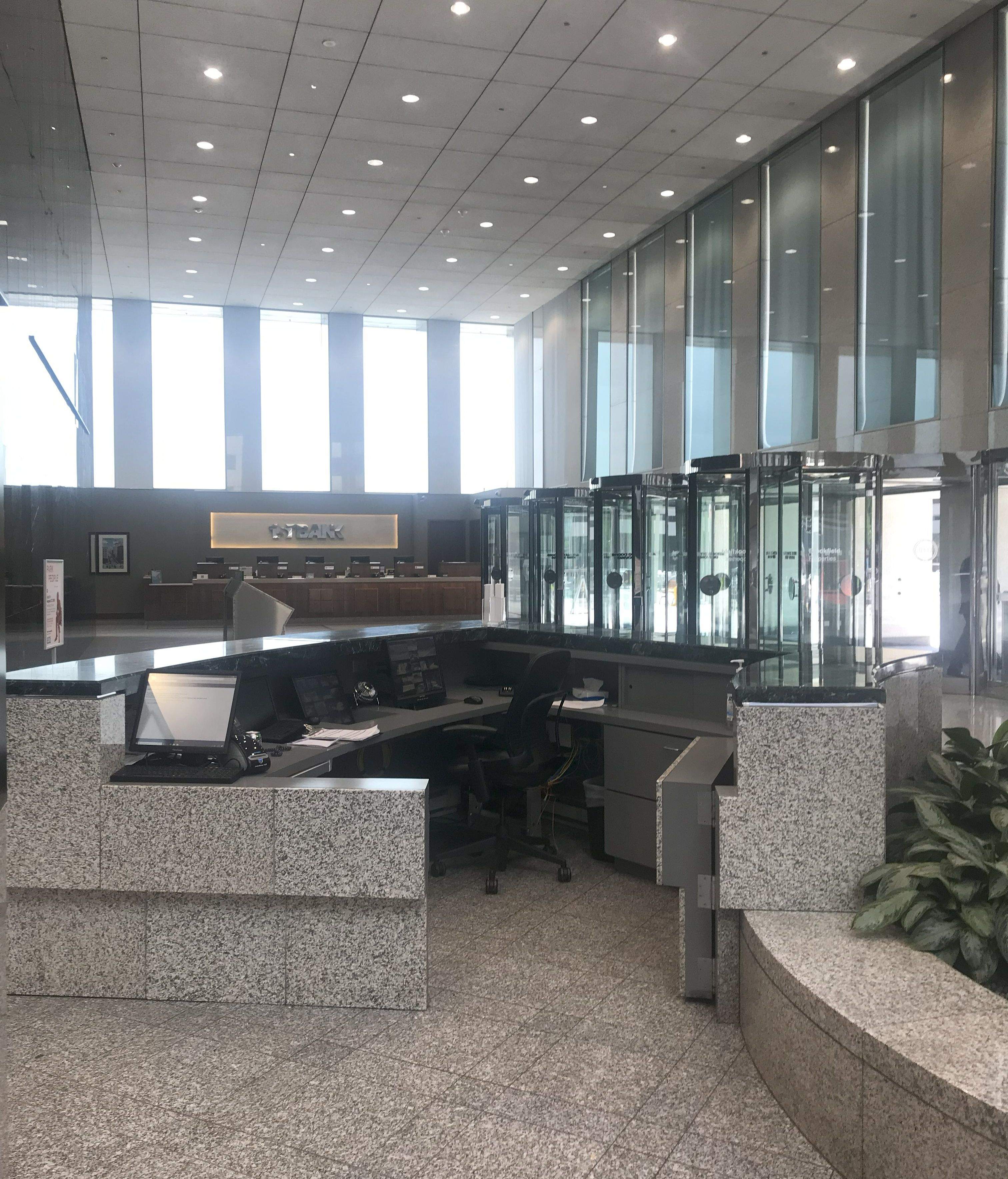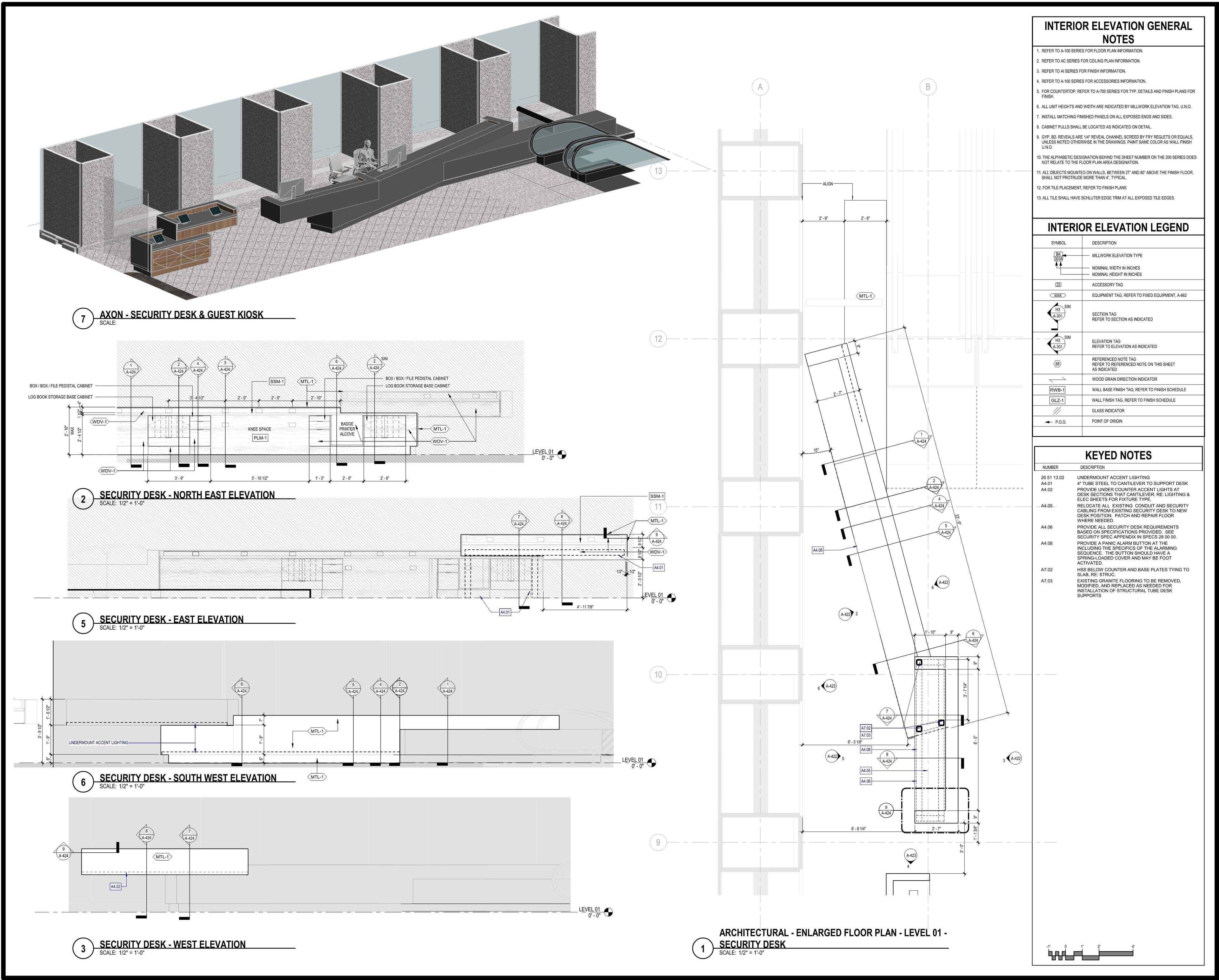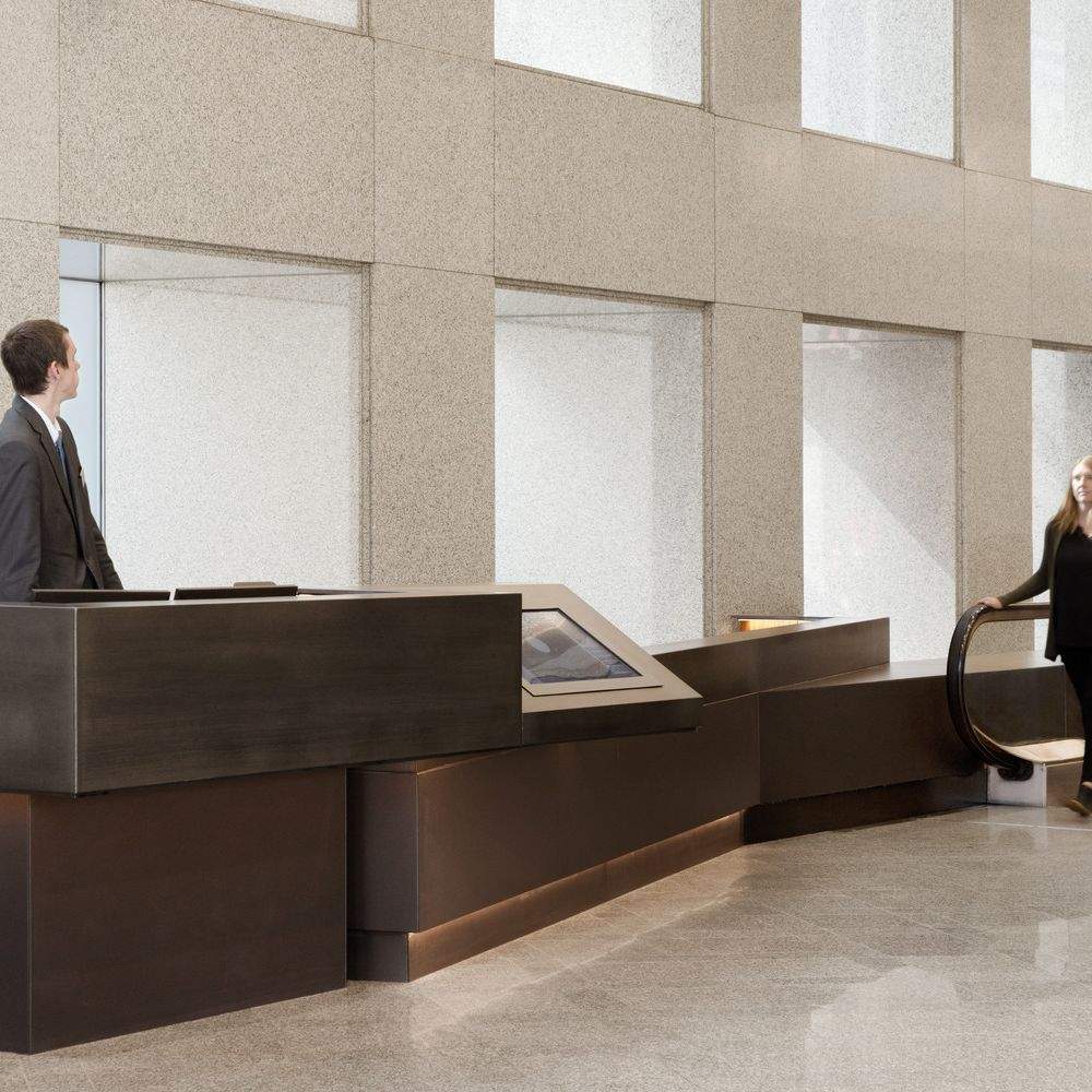 The security desk merges form and function with integrated lighting, guest kiosks, and varied counter heights for accessibility. Concealed technology, built for flexibility, maintains a clean appearance, while its sculpted form integrates into the space. Designed within tight spatial and technical constraints, the desk required careful coordination of systems and detailing, ultimately expressed through steel, wood veneer millwork, and solid surface counters.