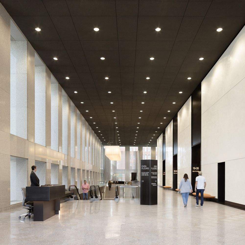 The furniture selections in the Republic Plaza lobby lean toward a hospitality aesthetic, with lounge groupings that soften the scale of the vast interior.