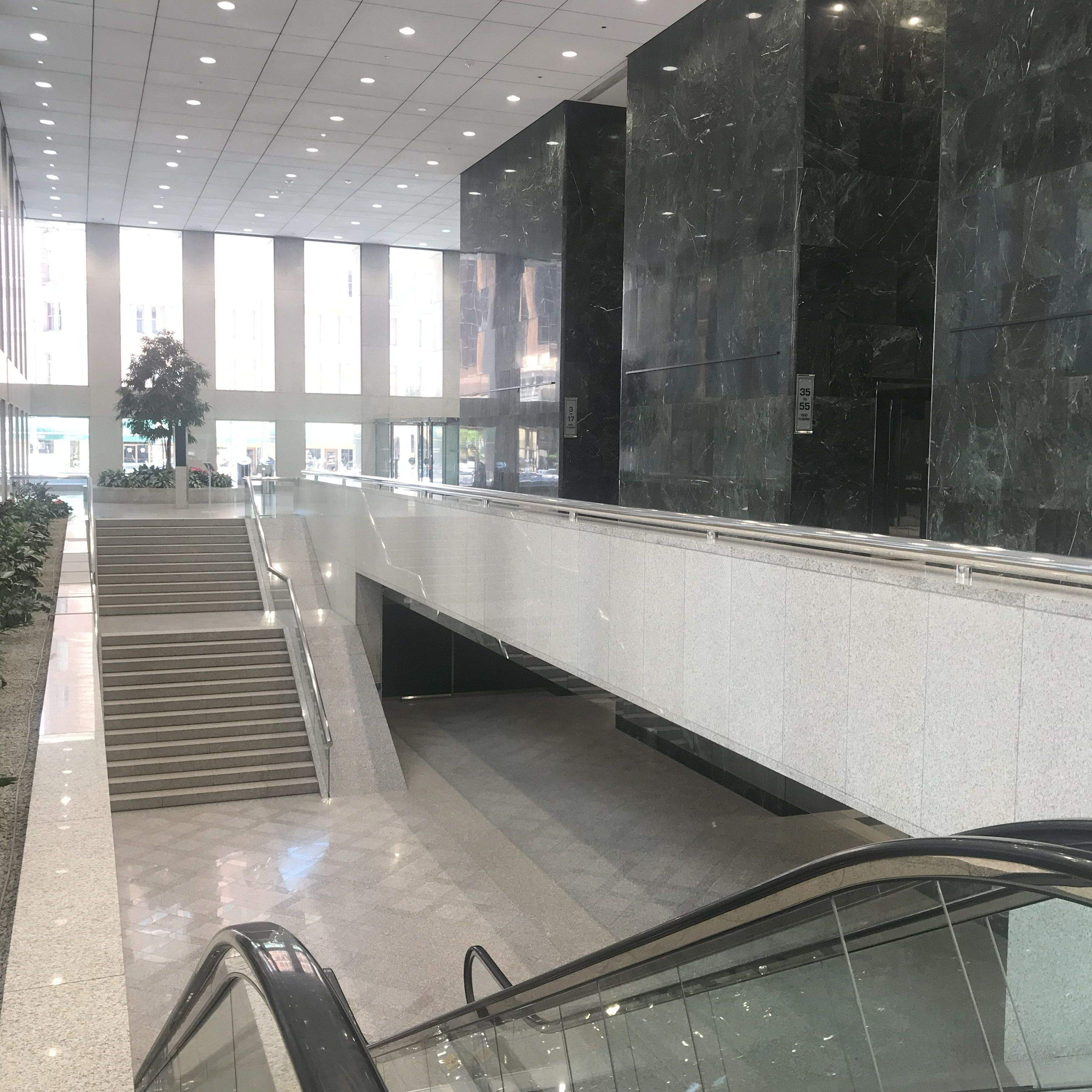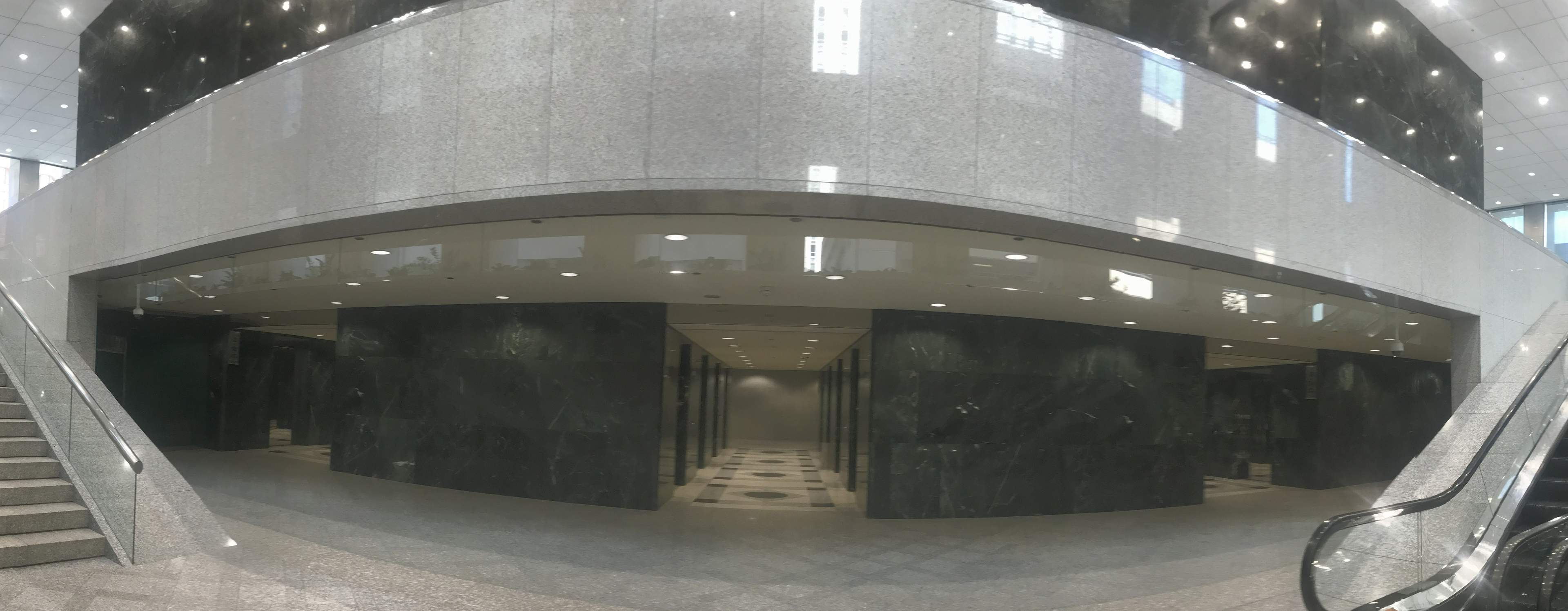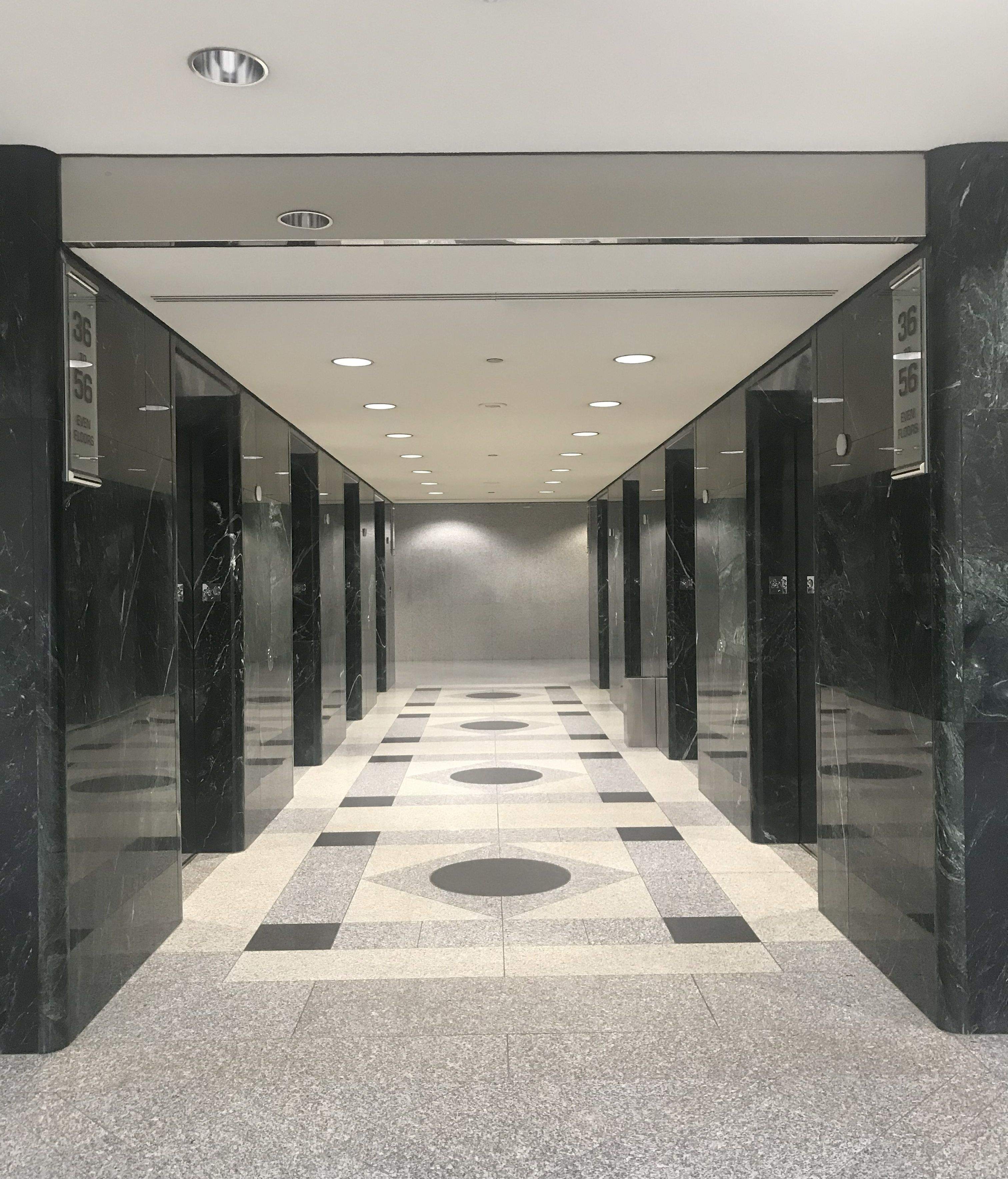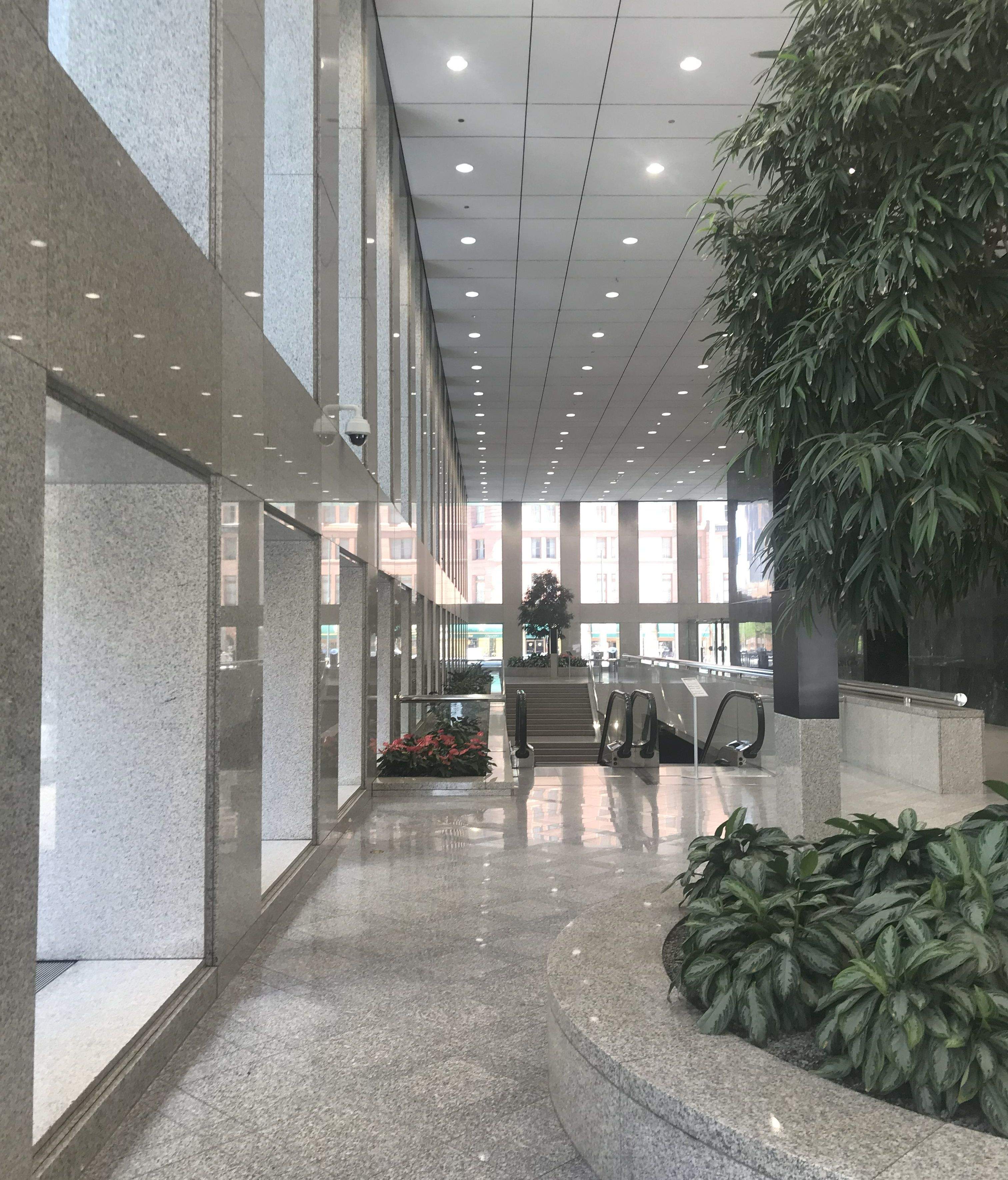Before the renovation, the Republic Plaza lobby showed its 1980s roots with dark stone, green marble elevator surrounds, and a formal, dated atmosphere. The vast space included large stone planters, offered little seating or engagement, and the exterior plaza lacked amenities, functioning more as a pass-through than a destination.