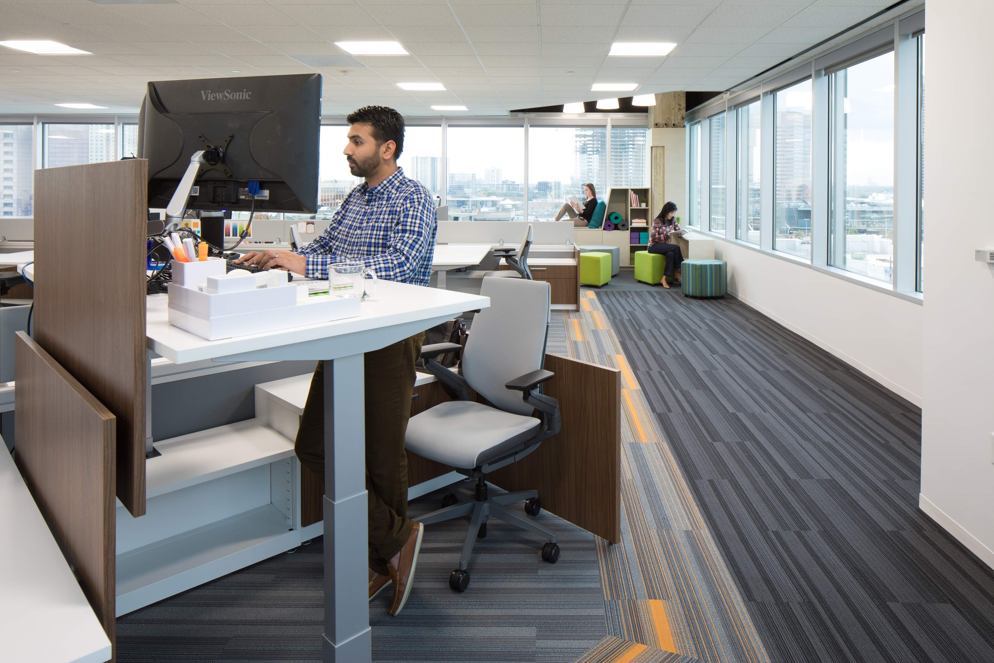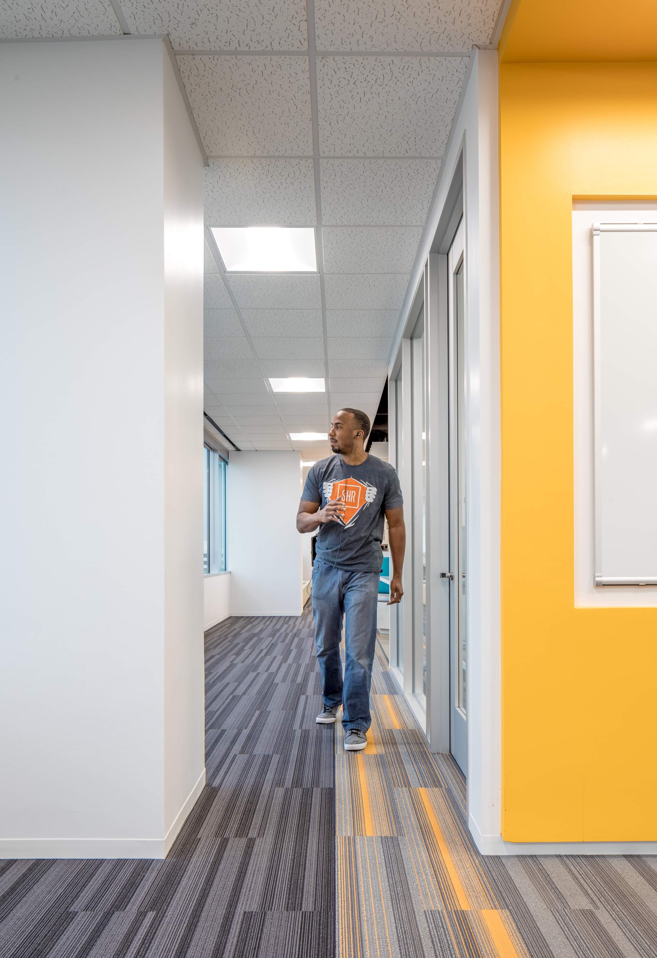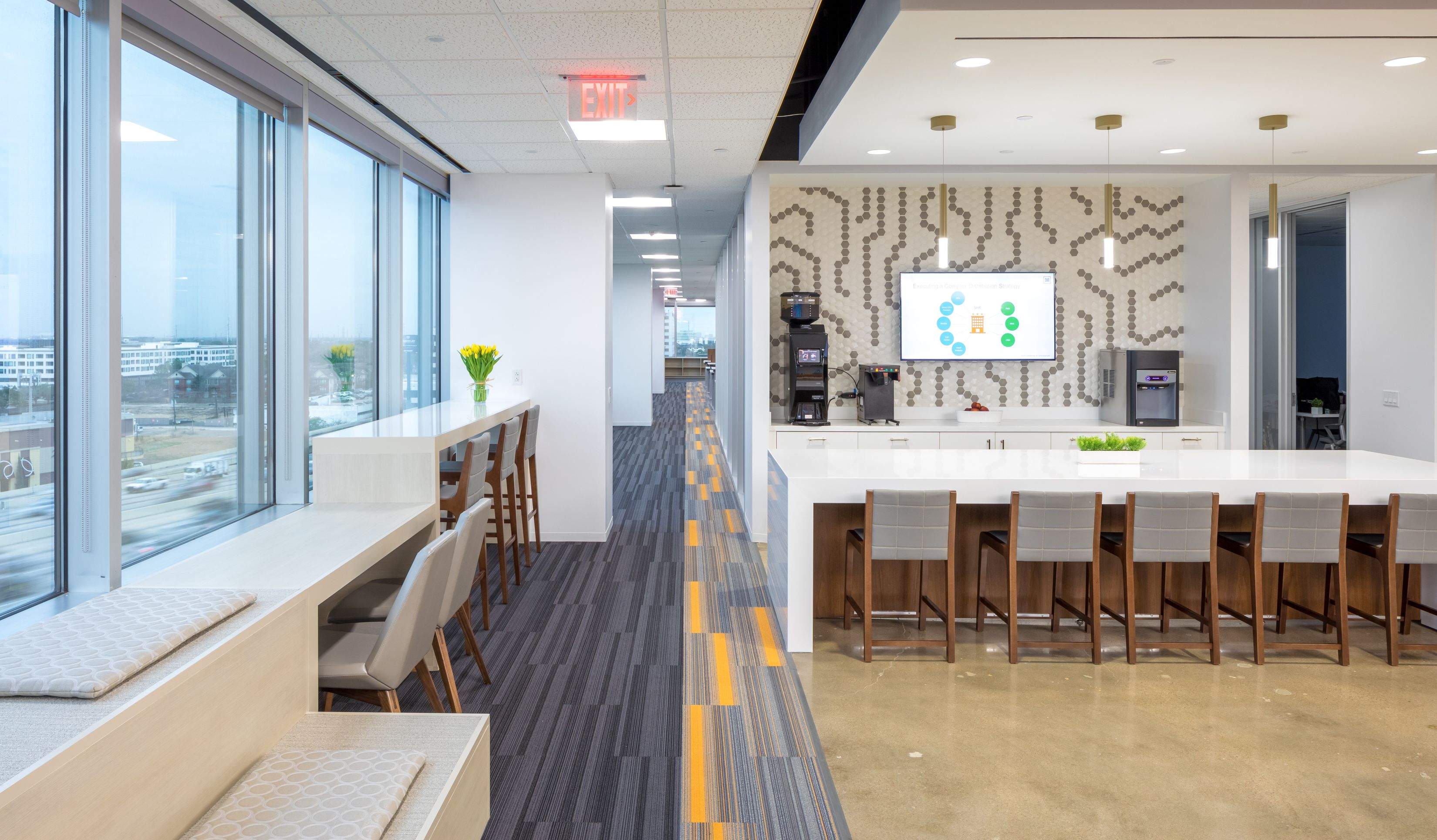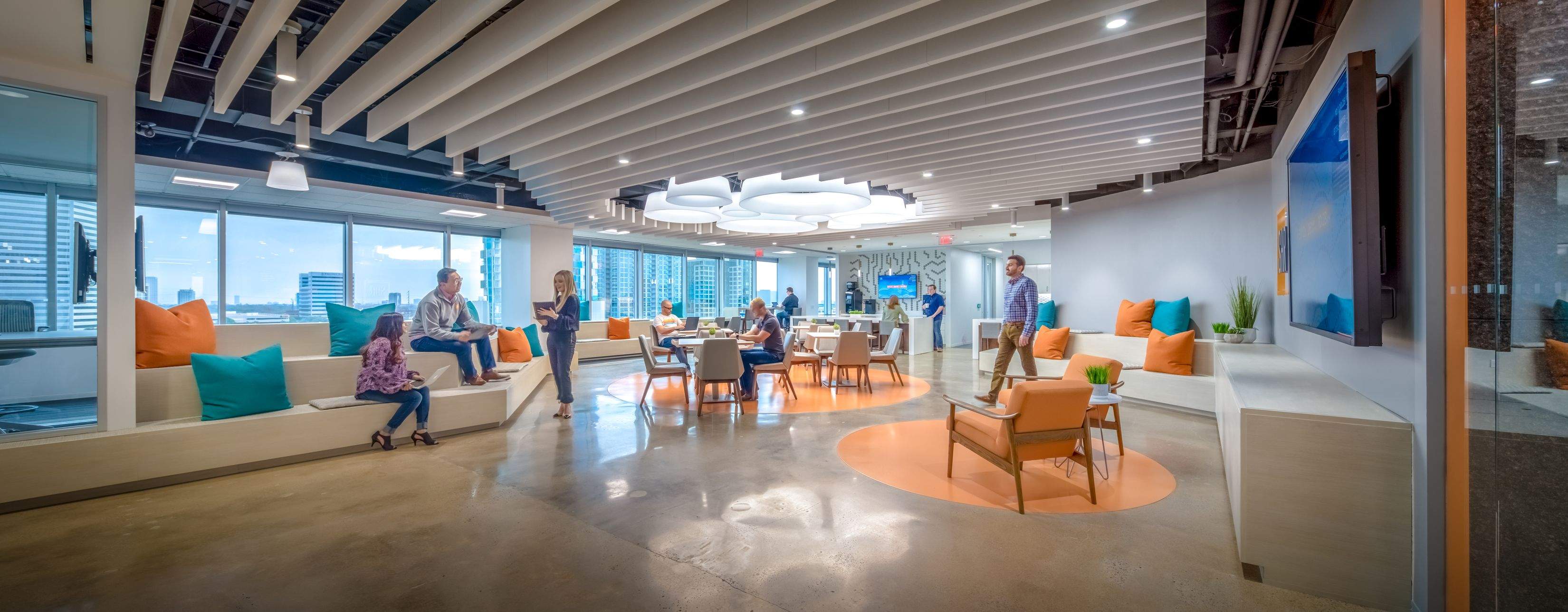 The lobby seamlessly transitions into the breakroom, a deliberate design move that reinforces the company’s culture of connection. The space hosts frequent fireside chats, features a bell to celebrate major wins, and incorporates wrap-around stadium seating alongside abundant café-style and breakroom seating, supporting everything from daily breaks to informal gatherings.