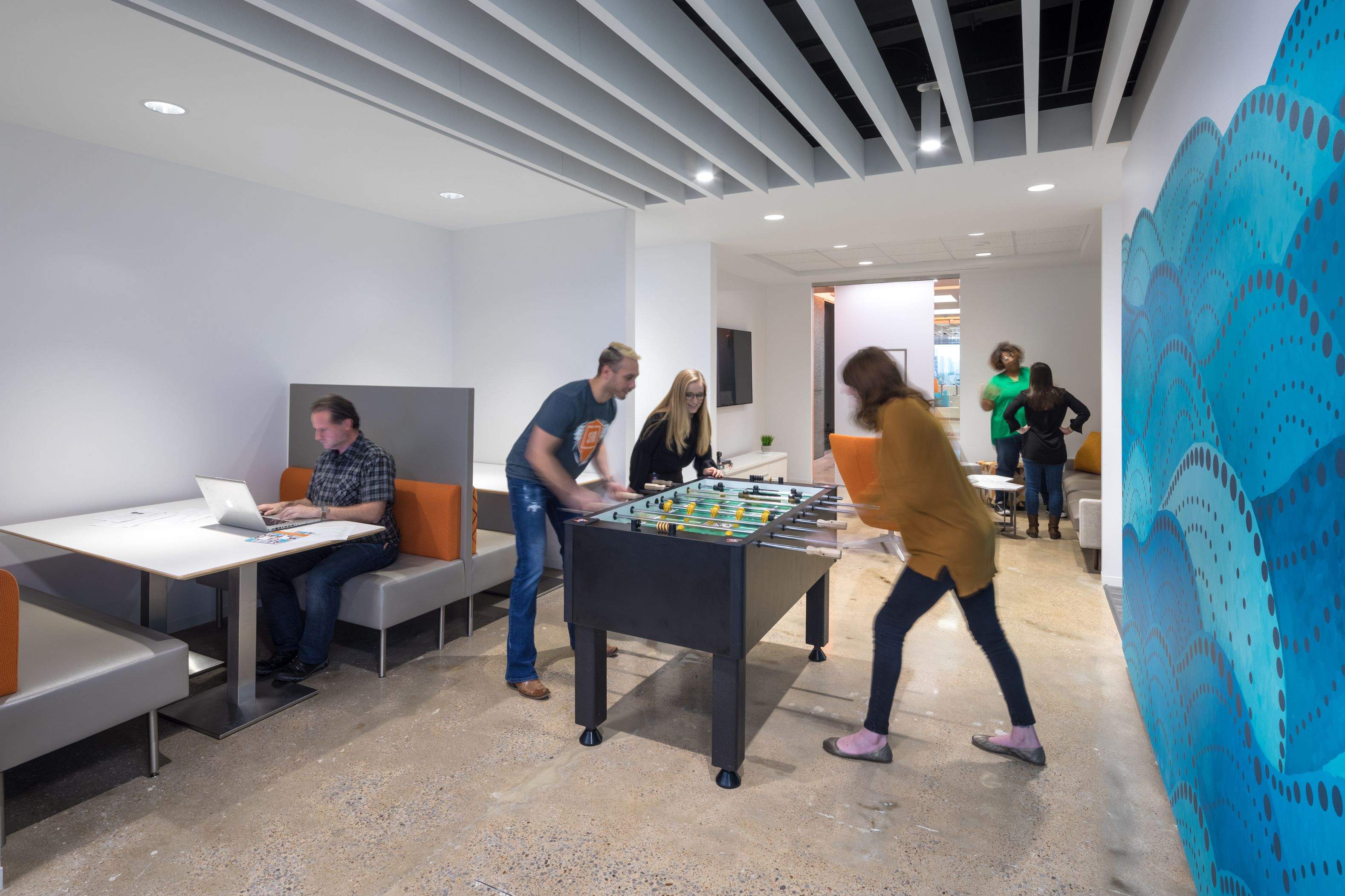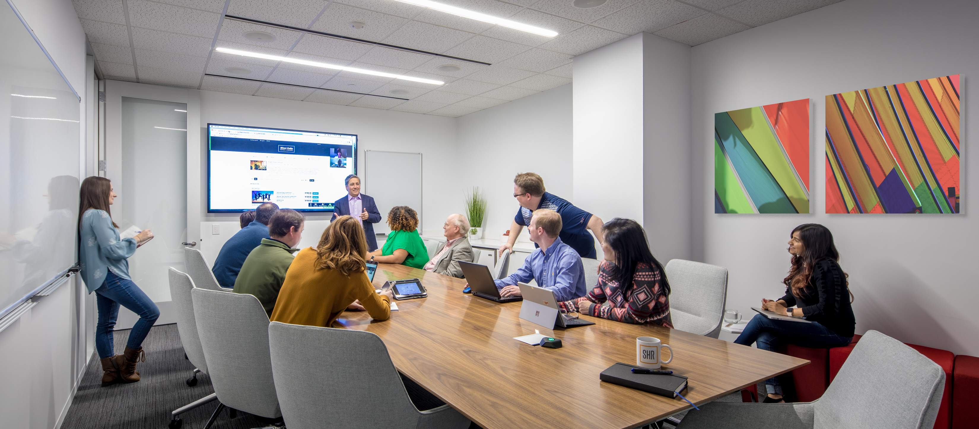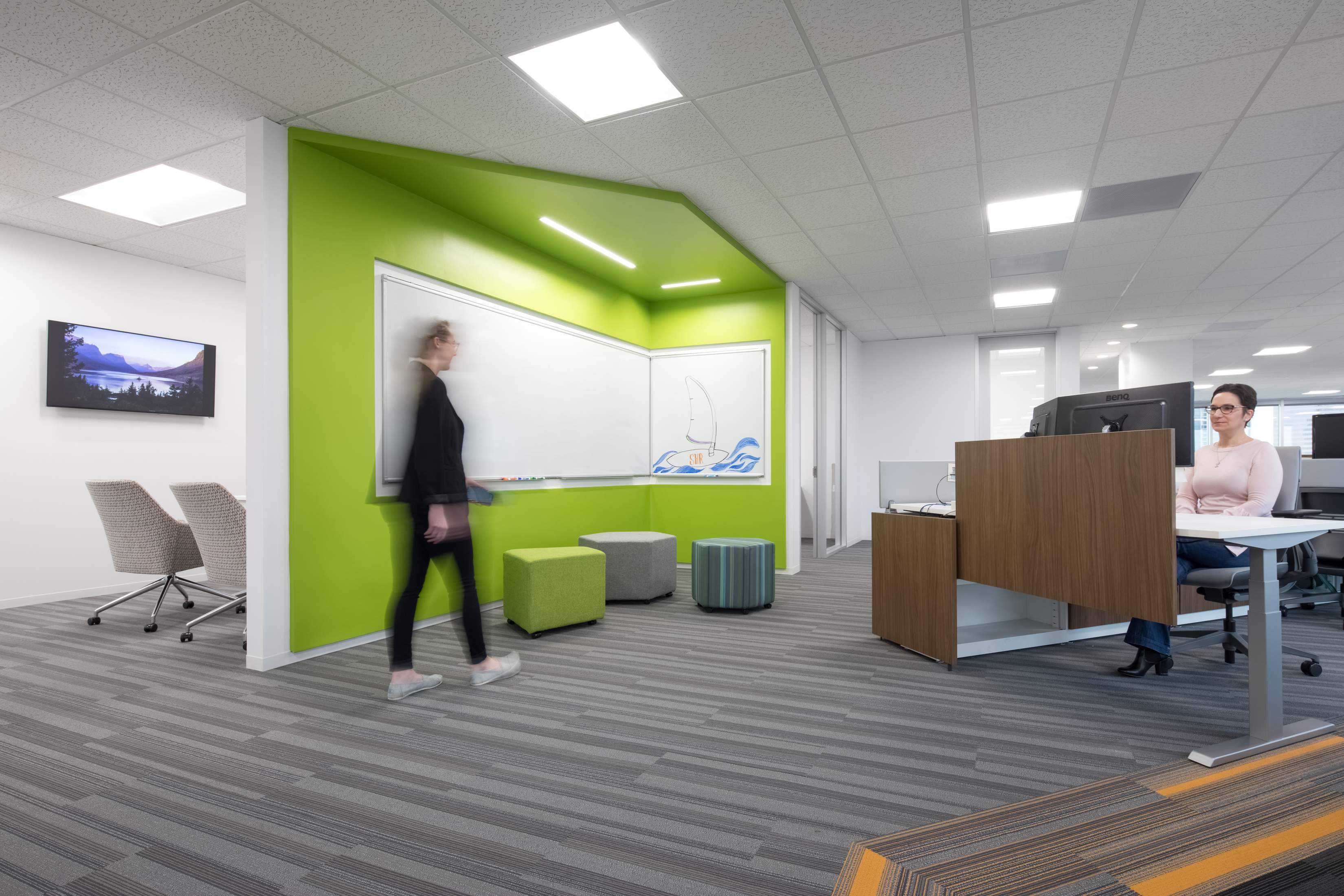 The workplace was choreographed as a series of experiences: a hospitality-inspired lobby with a fireside gathering zone, an open café-style breakroom encouraging impromptu dialogue, and meeting rooms elevated with stimulating graphics, color, and materials.
