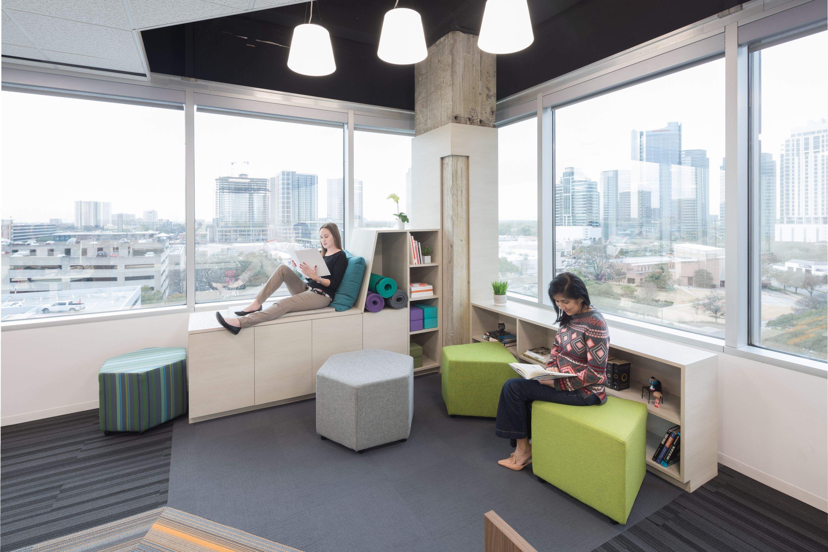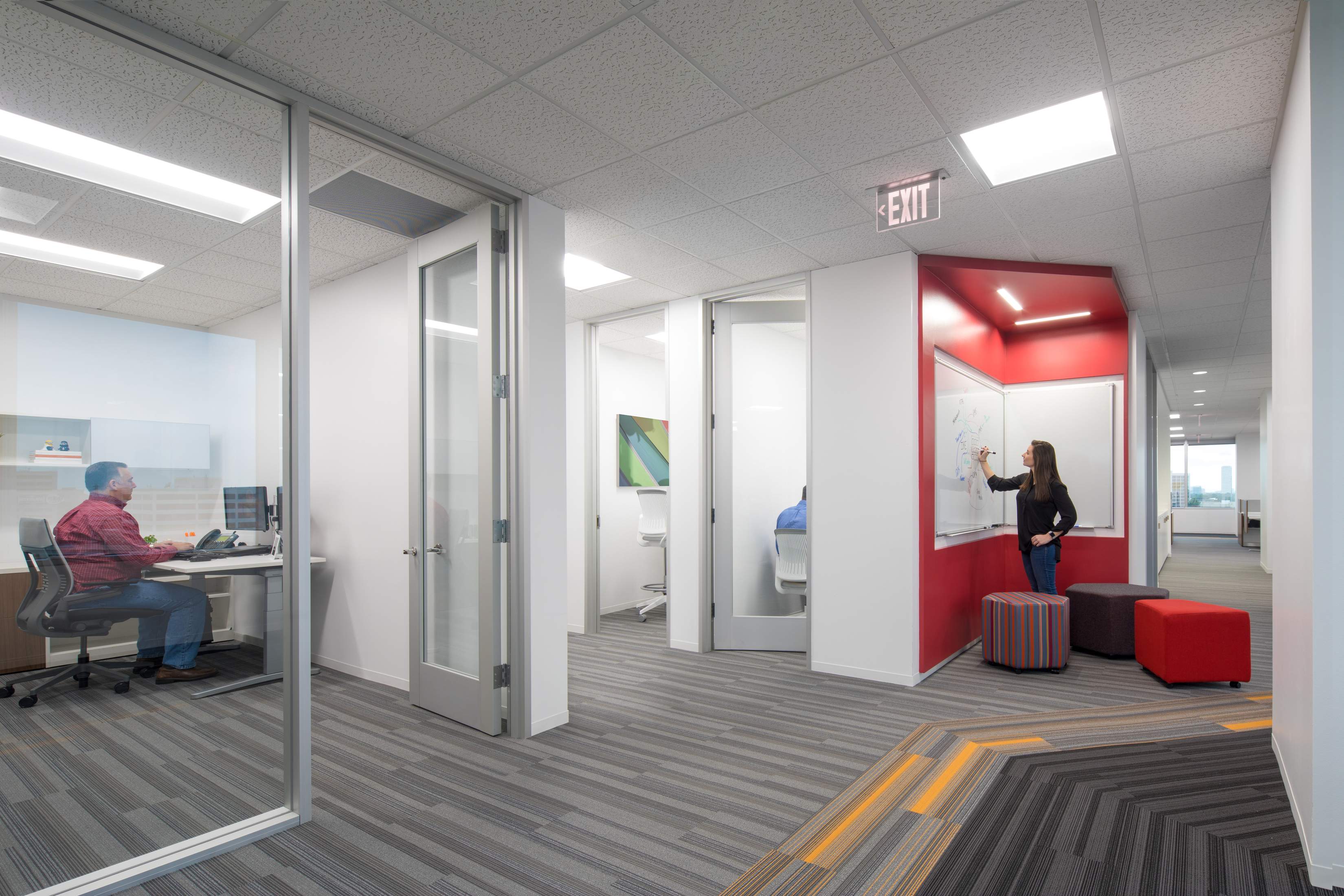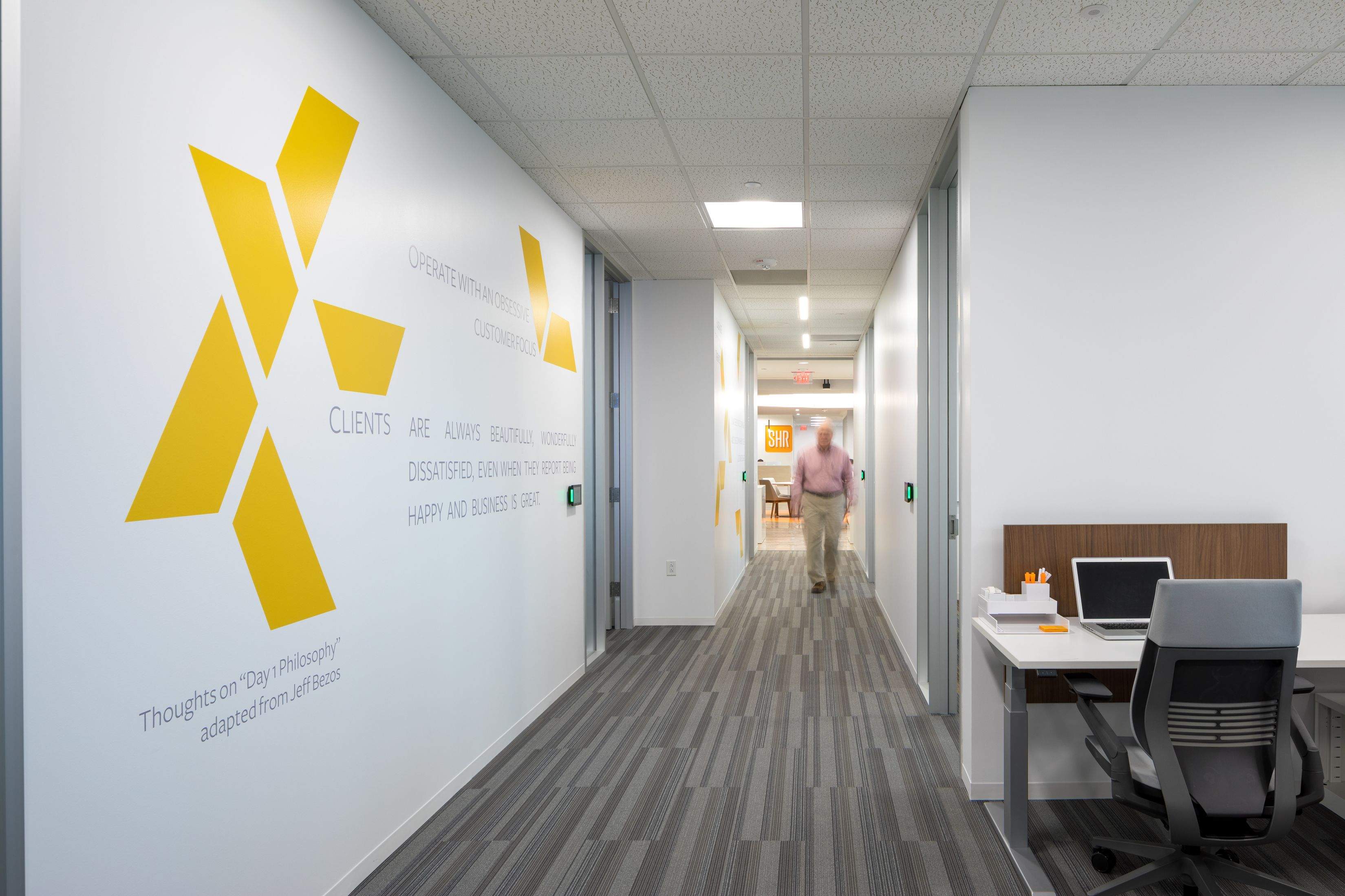 The workplace was choreographed as a series of experiences: a hospitality-inspired lobby with a fireside gathering zone, an open café-style breakroom encouraging impromptu dialogue, and meeting rooms elevated with stimulating graphics, color, and materials.